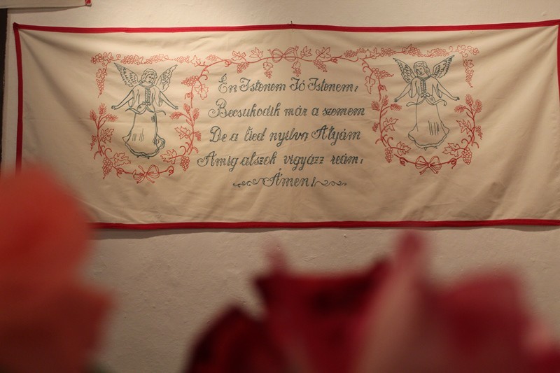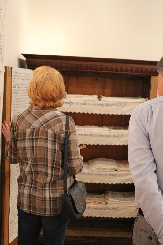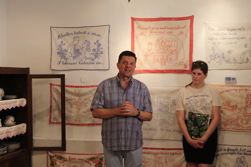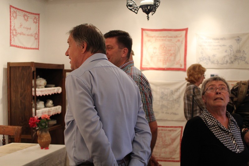 A június 24-én 17:30-tól éjfélig tartó rendezvényt a tájház új időszaki kiállításának (Ha a falak beszélni tudnának…) megnyitásával kezdtük. A dédszüleink, nagyszüleink világát (értékrendjét, vágyálmait, humorát) idéző régi falvédők és különböző hímzett, szöveges textíliák között vannak klasszikus műalkotások leegyszerűsített rajzai, bibliai és Petőfi idézetek, egykoron népszerű magyar nóták szövegrészletei és sok idilli ábrázolás a konyhájával, főztjével büszkélkedő háziasszonyról.