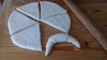 A kelesztés eredménye: megkelt a tészta, kezdődhet a munka, melynek során a kelt tésztából – több napig fantasztikusan puha és ízletes – vajas kifli készül.