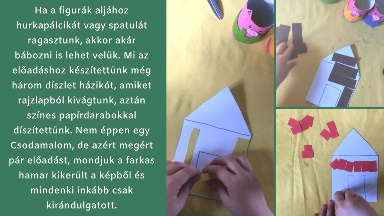 ? Ha a figurák aljához hurkapálcikát vagy spatulát ragasztunk, akkor akár bábozni is lehet velük. Mi az előadáshoz készítettünk még három díszlet házikót, amiket rajzlapból kivágtunk, aztán színes papírdarabokkal díszítettünk. Nem éppen egy Csodamalom, de azért megért pár előadást, mondjuk a farkas hamar kikerült a képből és mindenki inkább csak kirándulgatott.