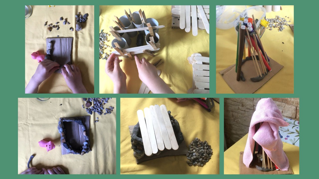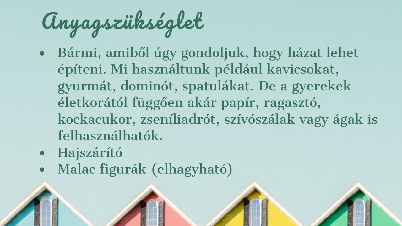 ? Nagyobb gyerekek esetén: pakoljunk ki egy asztalra ház építéséhez használható anyagokat. Hívjuk ki a gyerek(ek)et, hogy ki tud nehezebben lerombolható házat építeni, a megadott kellékekből.