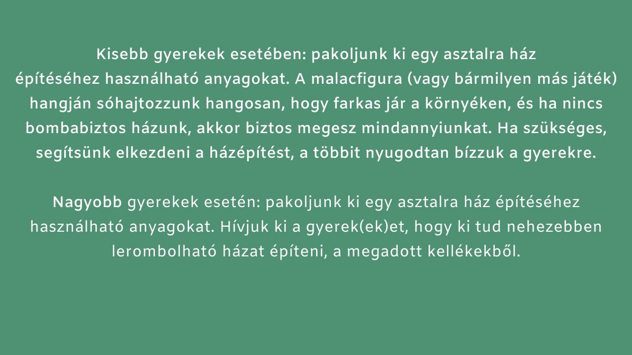? Kisebb gyerekek esetében: pakoljunk ki egy asztalra ház építéséhez használható anyagokat. A malacfigura (vagy bármilyen más játék) hangján sóhajtozzunk hangosan, hogy farkas jár a környéken, és ha nincs bombabiztos házunk, akkor biztos megesz mindannyiunkat. Ha szükséges, segítsünk elkezdeni a házépítést, a többit nyugodtan bízzuk a gyerekre.