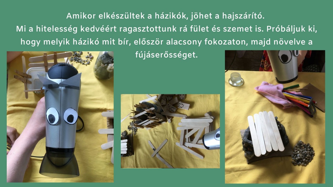? Amikor elkészültek a házikók, jöhet a hajszárító. Mi a hitelesség kedvéért ragasztottunk rá fület és szemet is. Próbáljuk ki, hogy melyik házikó mit bír, először alacsony fokozaton, majd növelve a fújáserősséget.