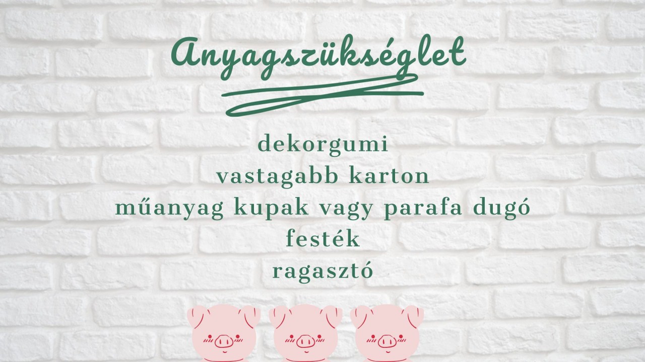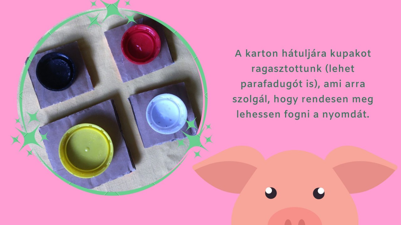 ? Ehhez a képhez először is a saját nyomdáinkat alkottuk meg. Készítettünk nyomdát a szalma-, a fa- és a téglaházfalához, valamint a malacokhoz. Vastagabb kartonból négyzeteket vágtunk és erre helyeztük el a dekrogumiból kivágott mintát. A szalmaházhoz vékony csíkokat ragasztottunk fel, a faházhoz hosszabb deszkaszerű sávokat, a téglaházhoz pedig téglamintát. Ügyeljünk arra, hogy ne ragasszuk nagyon szorosan egymás mellé a formákat, hanem maradjon közöttük egy kis hely, mert úgy fogja szépen kiadni a mintát. A karton hátuljára kupakot ragasztottunk (lehet parafadugót is), ami arra szolgál, hogy rendesen meg lehessen fogni a nyomdát.