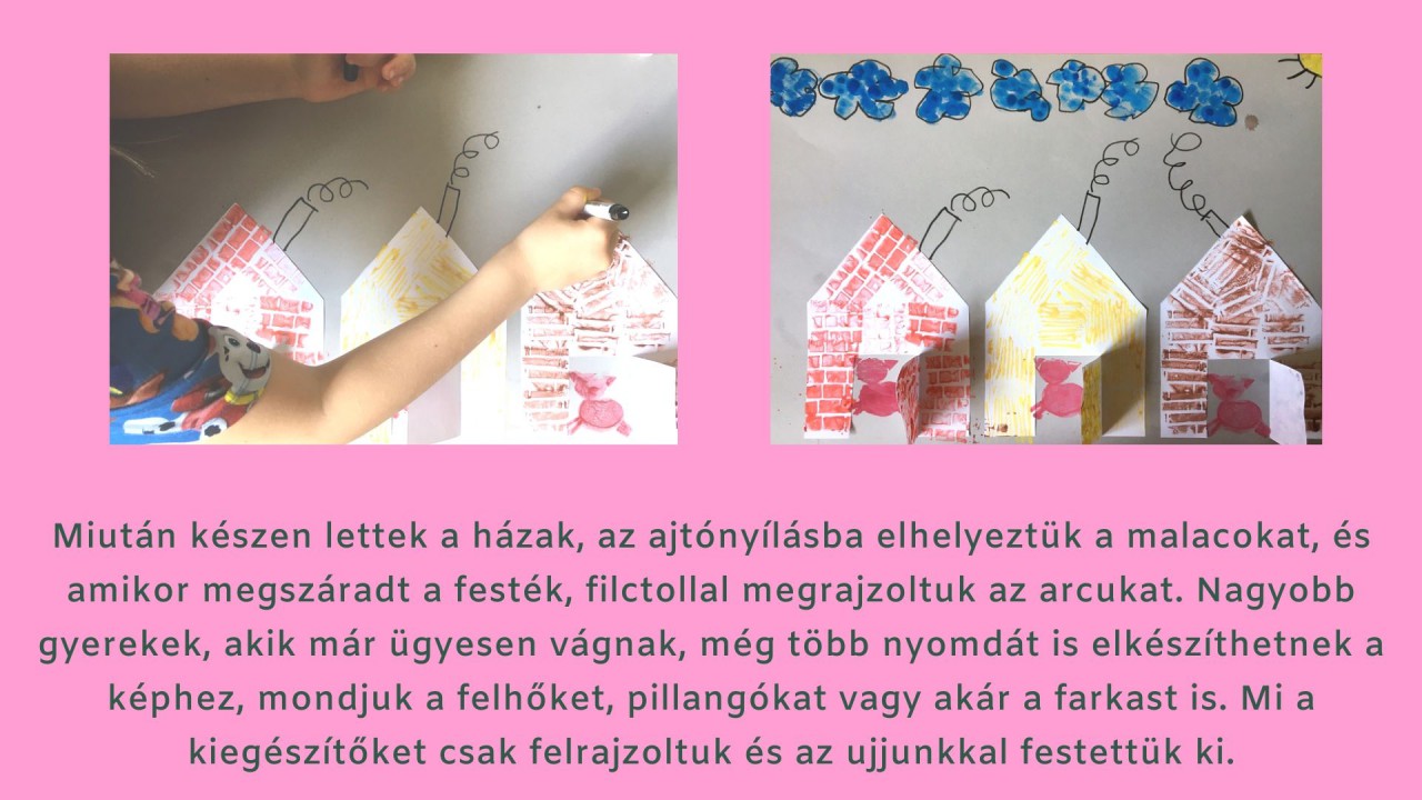 ? Miután készen lettek a házak, az ajtónyílásba elhelyeztük a malacokat, és amikor megszáradt a festék, filctollal megrajzoltuk az arcukat. Nagyobb gyerekek, akik már ügyesen vágnak, még több nyomdát is elkészíthetnek a képhez, mondjuk a felhőket, pillangókat vagy akár a farkast is. Mi a kiegészítőket csak felrajzoltuk és az ujjunkkal festettük ki.