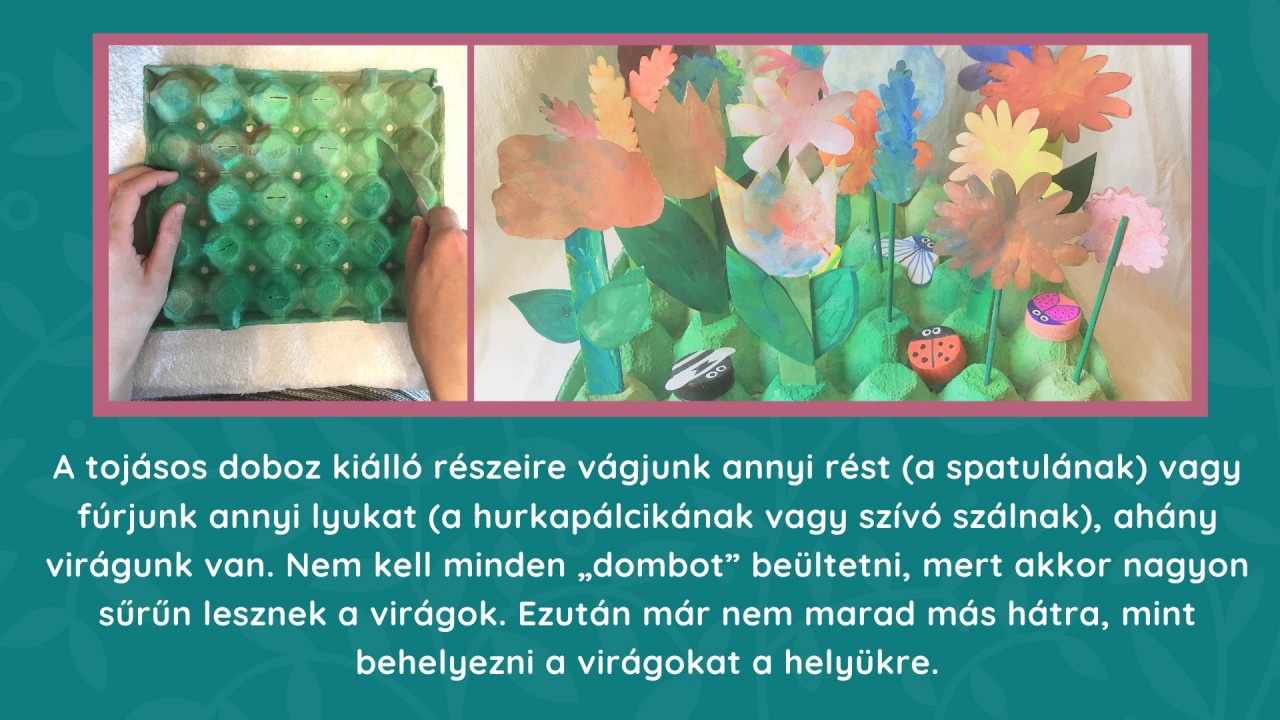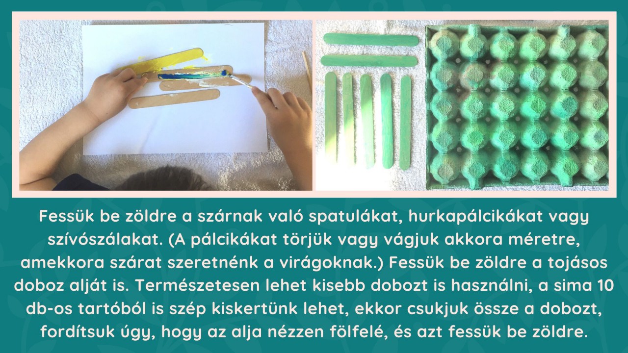 ? Fessük be zöldre a szárnak való spatulákat, hurkapálcikákat vagy szívószálakat. (A pálcikákat törjük vagy vágjuk akkora méretre, amekkora szárat szeretnénk a virágoknak.) Fessük be zöldre a tojásos doboz alját is. Természetesen lehet kisebb dobozt is használni, a sima 10 db-os tartóból is szép kiskertünk lehet, ekkor csukjuk össze a dobozt, fordítsuk úgy, hogy az alja nézzen fölfelé, és azt fessük be zöldre. A 30 db-os tartót is vághatjuk kisebb részekre, attól függően, hogy mennyi virágot szeretnénk készíteni (és mennyi türelme van a gyereknek, mi úgy csináltuk, hogy egy hétig minden nap foglalkoztunk vele valamennyit, így nem unta meg.)