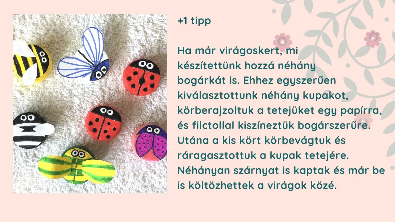 ? +1 Ha már virágos kert, mi készítettünk hozzá néhány bogárkát is. Ehhez egyszerűen kiválasztottunk néhány kupakot, körberajzoltuk a tetejüket egy papírra, és filctollal kiszíneztük bogárszerűre. Utána a kis kört körbevágtuk és ráragasztottuk a kupak tetejére. Néhányan szárnyat is kaptak és már be is költözhettek a virágok közé.