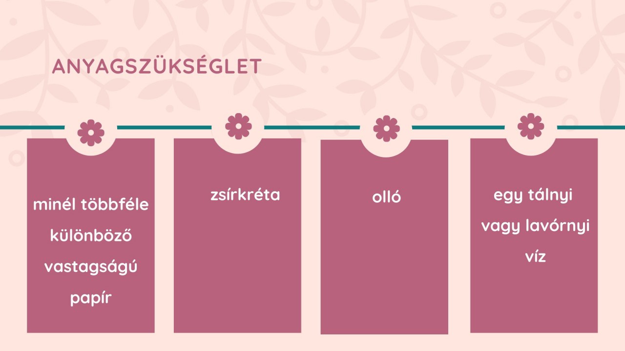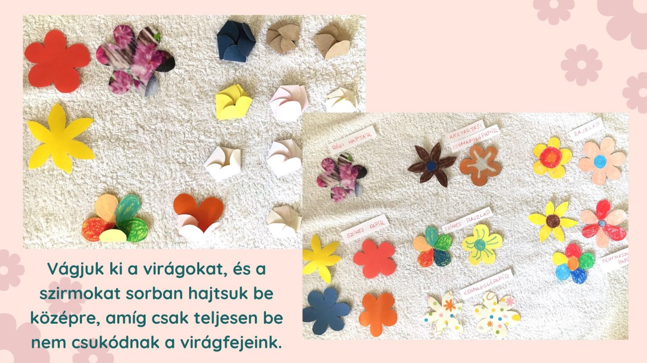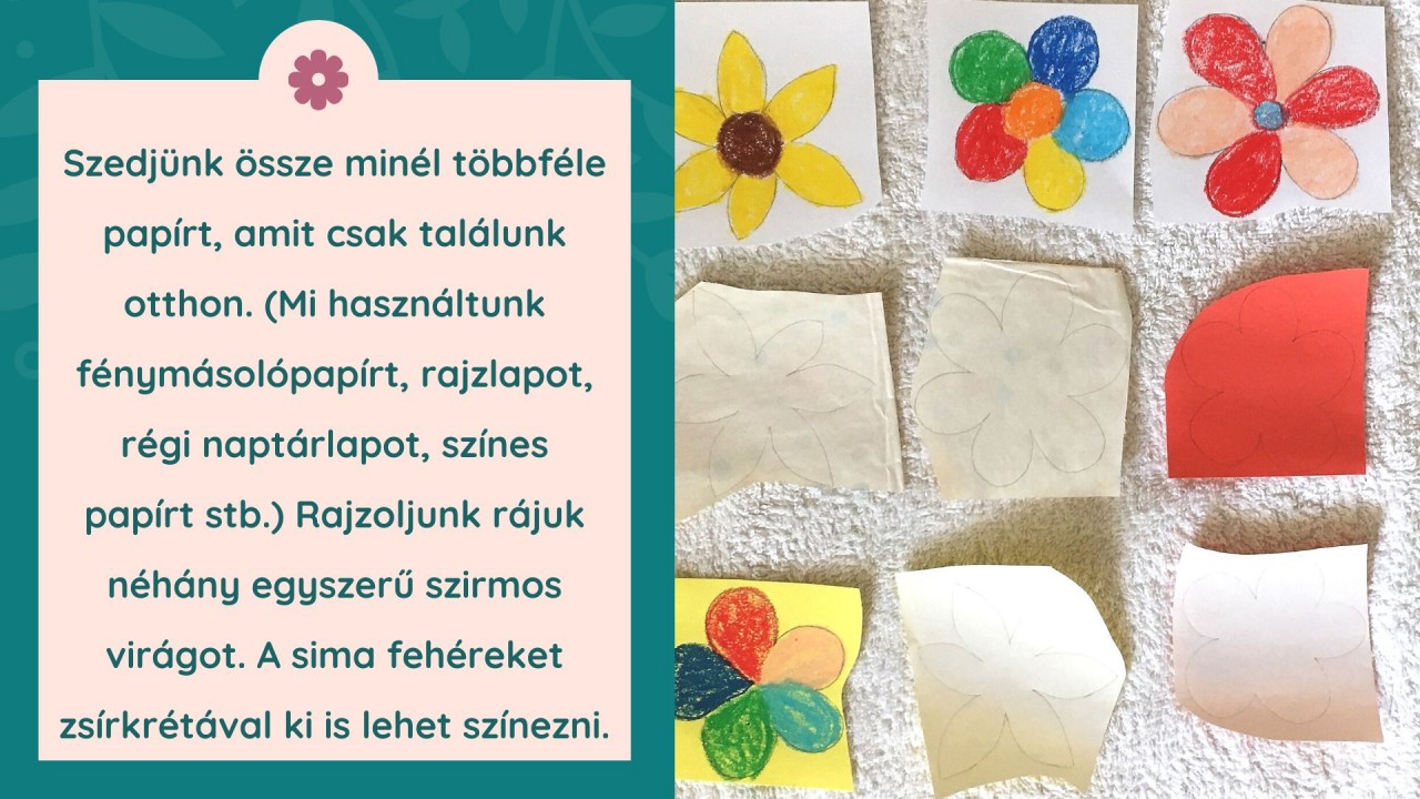 ? Szedjünk össze minél többféle papírt, amit csak találunk otthon. (Mi használtunk fénymásolópapírt, rajzlapot, régi naptárlapot, színes papírt stb.) Rajzoljunk rájuk néhány egyszerű szirmos virágot. A sima fehéreket zsírkrétával ki is lehet színezni, de ez a lépés elhagyható.