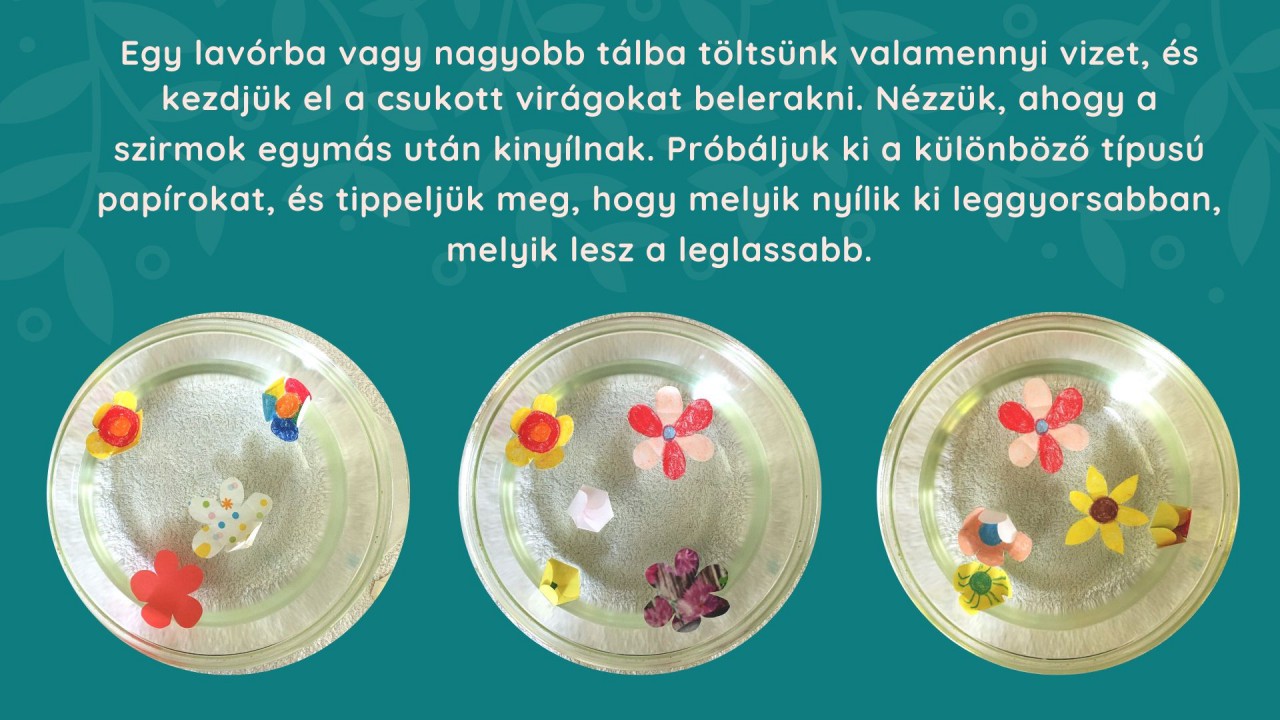 ? Egy lavórba vagy nagyobb tálba töltsünk valamennyi vizet, és kezdjük el a csukott virágokat belerakni. Nézzük, ahogy a szirmok egymás után kinyílnak. Próbáljuk ki a különböző típusú papírokat, és tippeljük meg, hogy melyik nyílik ki leggyorsabban, melyik lesz a leglassabb.