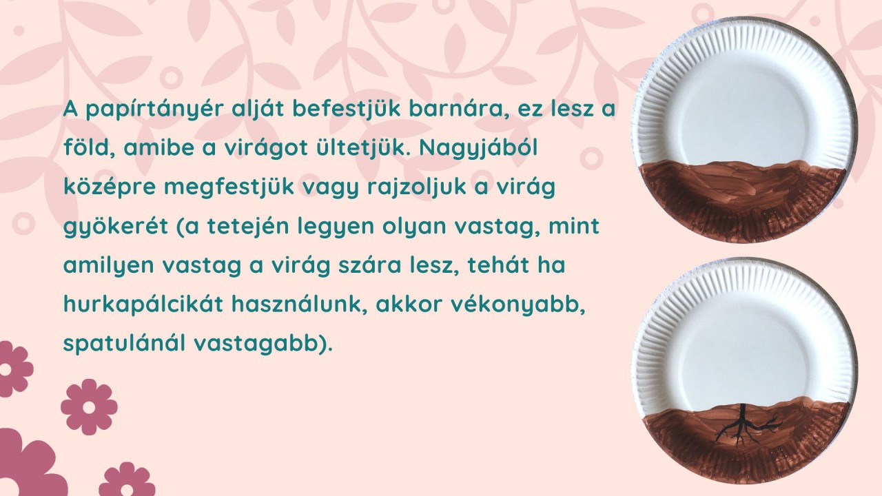 ? A papírtányér alját befestjük barnára, ez lesz a föld, amibe a virágot ültetjük. Nagyjából középre megfestjük vagy rajzoljuk a virág gyökerét (a tetején legyen olyan vastag, mint amilyen vastag a virág szára lesz, tehát ha hurkapálcikát használunk, akkor vékonyabb, spatulánál vastagabb).