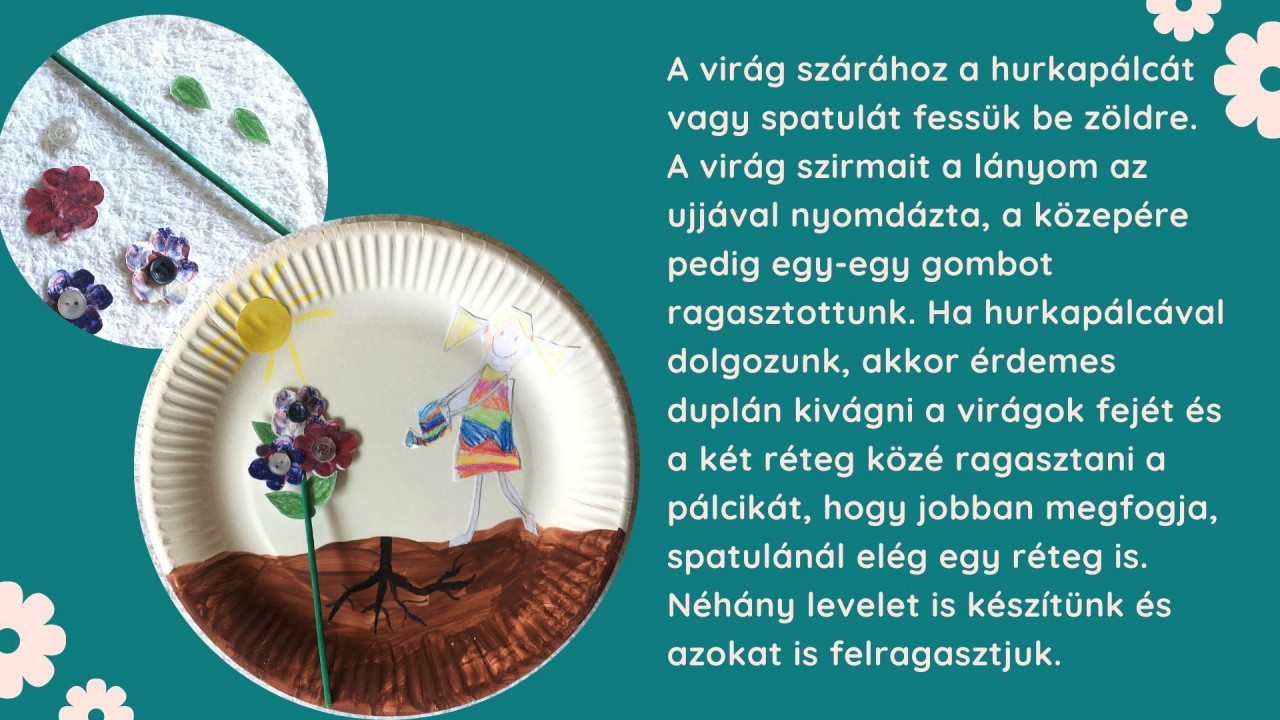 ? A virág szárához a hurkapálcát vagy spatulát fessük be zöldre. A virág szirmait a lányom az ujjával nyomdázta, a közepére pedig egy-egy gombot ragasztottunk. Ha hurkapálcával dolgozunk, akkor érdemes duplán kivágni a virágok fejét és a két réteg közé ragasztani a pálcikát, hogy jobban megfogja, spatulánál elég egy réteg is. Néhány levelet is készítünk és azokat is felragasztjuk.