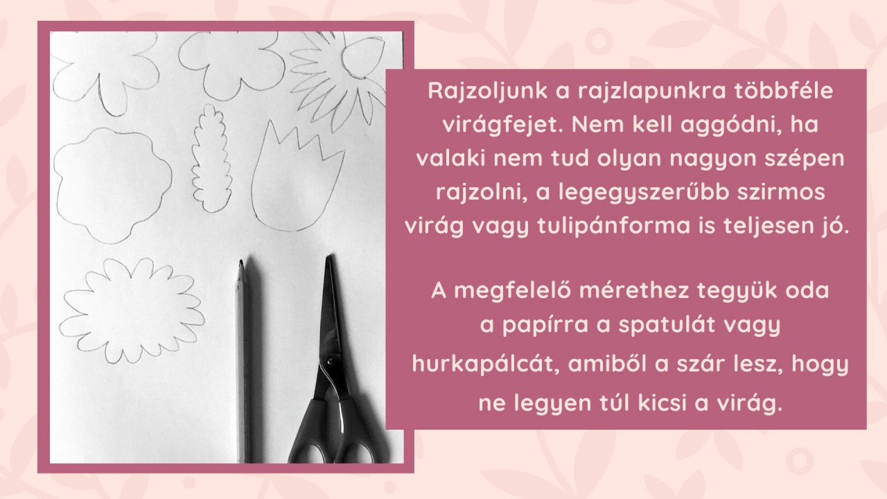 ? Rajzoljunk a rajzlapunkra többféle virágfejet. Nem kell aggódni, ha valaki nem tud olyan nagyon szépen rajzolni, a legegyszerűbb szirmos virág vagy tulipánforma is teljesen jó. A megfelelő mérethez tegyük oda a papírra a spatulát vagy hurkapálcát, amiből a szár lesz, hogy ne legyen túl kicsi a virág.