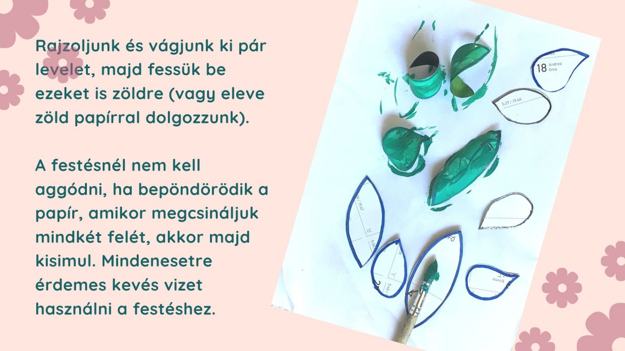 ?Rajzoljunk és vágjunk ki pár levelet, majd fessük be ezeket is zöldre (vagy eleve zöld papírral dolgozzunk). A festésnél nem kell aggódni, ha bepöndörödik a papír, amikor megcsináljuk mindkét felét, akkor majd kisimul. Mindenesetre érdemes kevés vizet használni a festéshez.