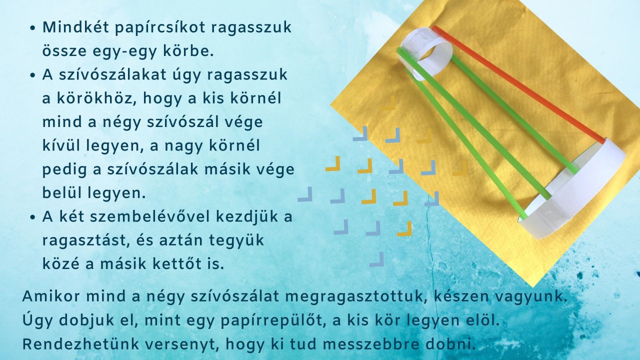 ? Mindkét papírcsíkot ragasszuk össze egy-egy körbe. A szívószálakat úgy ragasszuk a körökhöz, hogy a kis körnél mind a négy szívószál vége kívül legyen, a nagy körnél pedig a szívószálak másik vége belül legyen. A két szembelévővel kezdjük a ragasztást, és aztán tegyük közé a másik kettőt is. (Nem kell, hogy nagyon pontos legyen). Amikor mind a négy szívószálat megragasztottuk, készen vagyunk, úgy dobjuk el, mint egy papírrepülőt, a kis kör legyen elöl. Rendezhetünk versenyt, hogy ki tud messzebbre dobni.