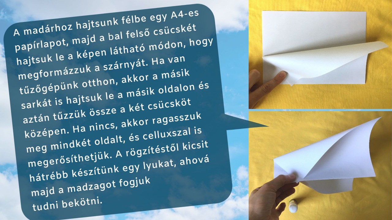 ?A madárhoz hajtsunk félbe egy A4-es papírlapot, majd a bal felső csücskét hajtsuk le a képen látható módon, hogy megformázzuk a szárnyát. Ha van tűzőgépünk otthon, akkor a másik sarkát is hajtsuk le a másik oldalon és aztán tűzzük össze a két csücsköt középen. Ha nincs, akkor ragasszuk meg mindkét oldalt, mi megerősítettük celluxszal is, hogy biztosan tartson. A rögzítéstől kicsit hátrébb készítünk egy lyukat, ahová majd a madzagot fogjuk tudni bekötni.