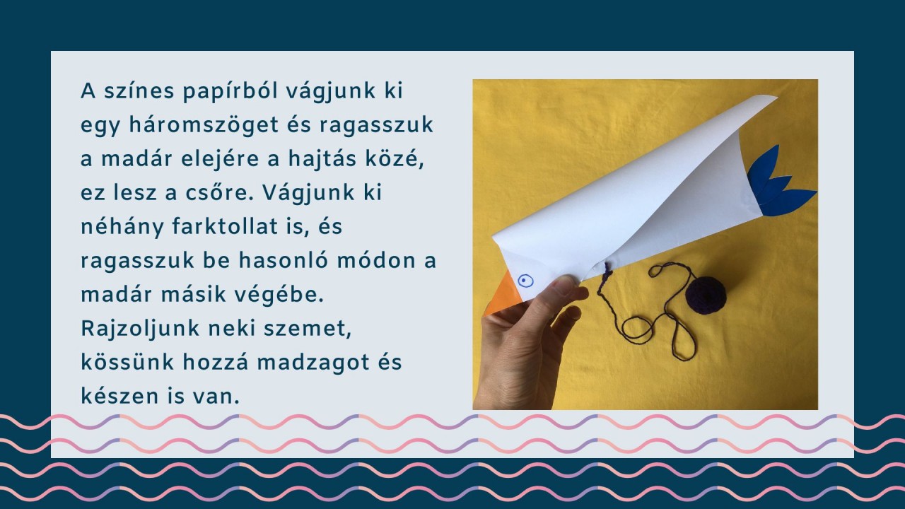 ? A színes papírból vágjunk ki egy háromszöget és ragasszuk a madár elejére a hajtás közé, ez lesz a csőre. Vágjunk ki néhány farktollat is és ragasszuk be hasonló módon a madár másik végébe. Rajzoljunk neki szemet, kössünk hozzá madzagot és kész is. Ha csak egy kis darab madzagot kötünk hozzá, akkor bent is tudjuk reptetni, de ha hosszú zsinórt hagyunk neki, és jó szél van, akkor papírsárkány szerűen tényleg magasra fel tudjuk engedni.