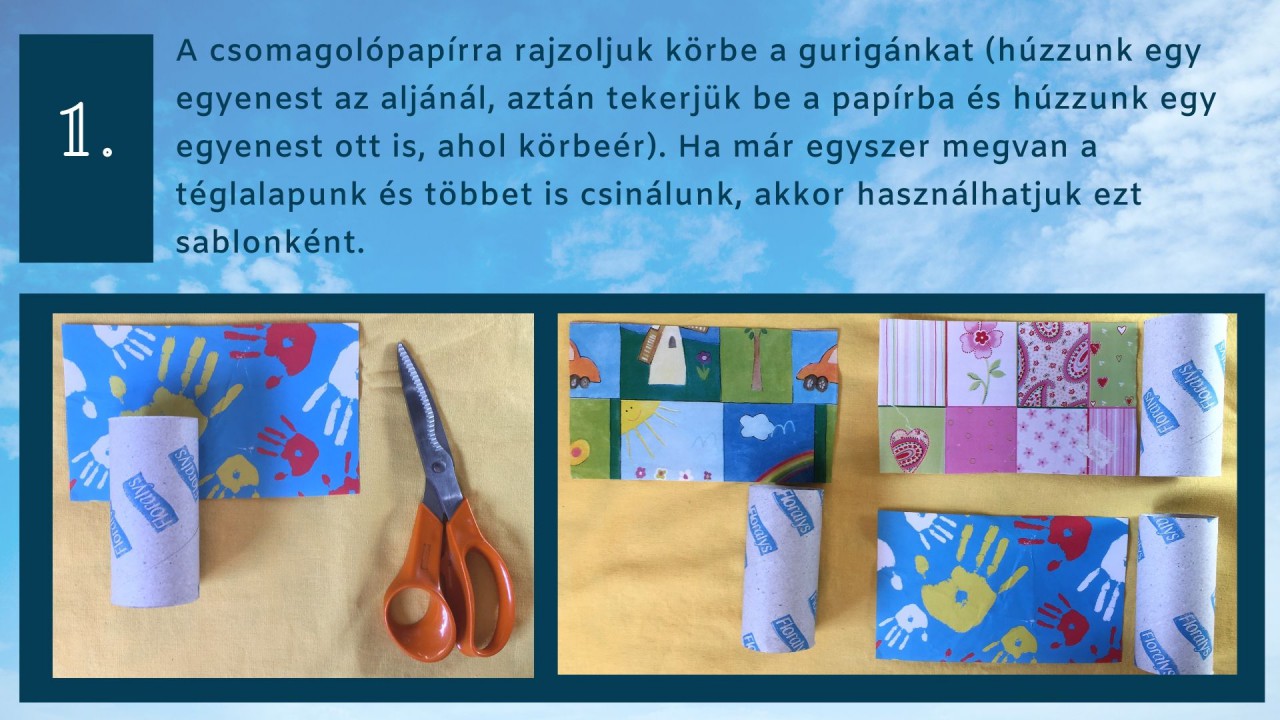 ? A csomagolópapírra rajzoljuk körbe a gurigánkat (húzzunk egy egyenest az aljánál, aztán tekerjük be a papírba és húzzunk egy egyenest ott is, ahol körbeér). Ha már egyszer megvan a téglalapunk és többet is csinálunk, akkor használhatjuk ezt sablonként.