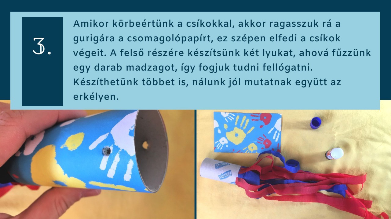 ? Amikor körbeértünk a csíkokkal, akkor ragasszuk rá a gurigára a csomagolópapírt, ez szépen elfedi a csíkok végeit. A felső részére készítsünk két lyukat, ahová fűzzünk egy darab madzagot, így fogjuk tudni fellógatni. Készíthetünk többet is, nálunk jól mutatnak együtt az erkélyen.