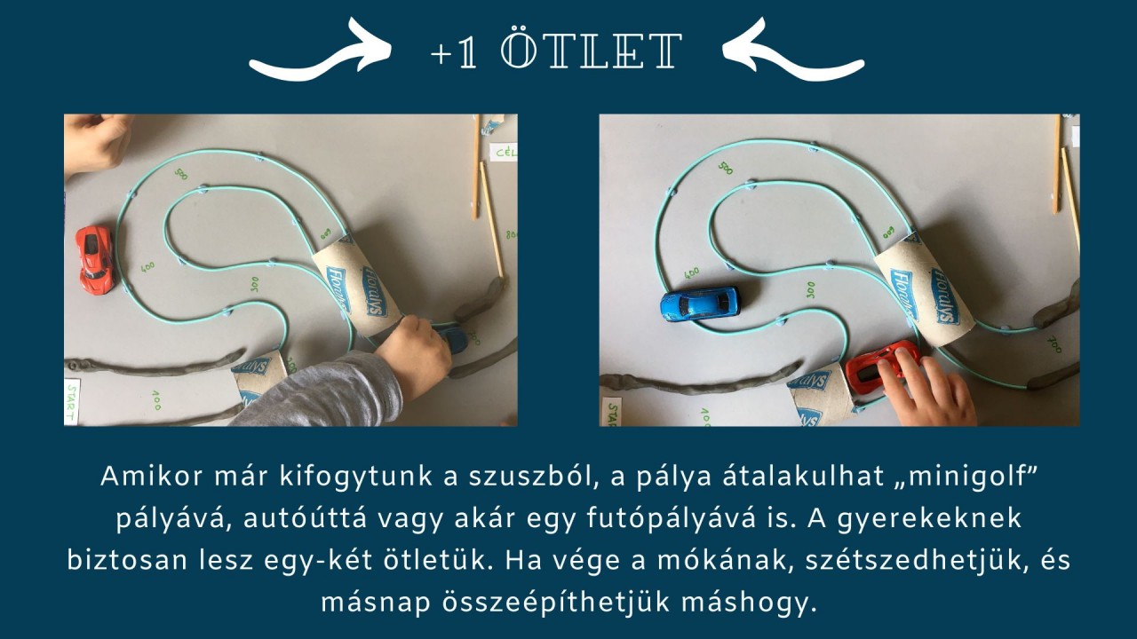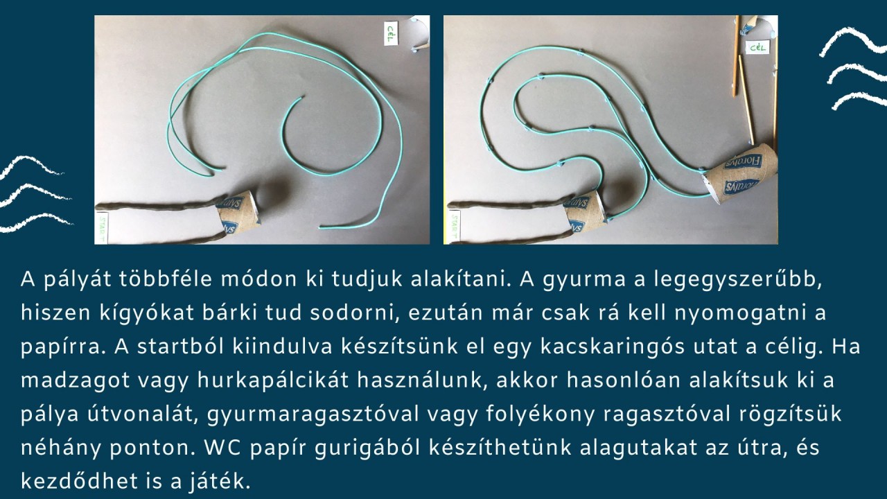 ⚓️ Ha madzagot vagy hurkapálcikát használunk, akkor hasonlóan alakítsuk ki a pálya útvonalát, gyurmaragasztóval vagy folyékony ragasztóval rögzítsük néhány ponton. Ebben az esetben érdemesebb kisebb alufólia golyóval játszani, mert a pingpong labdához ez egy kicsit alacsony „kerítés", nekünk könnyebben kirepült a pályáról, ha túl erősen fújtuk.