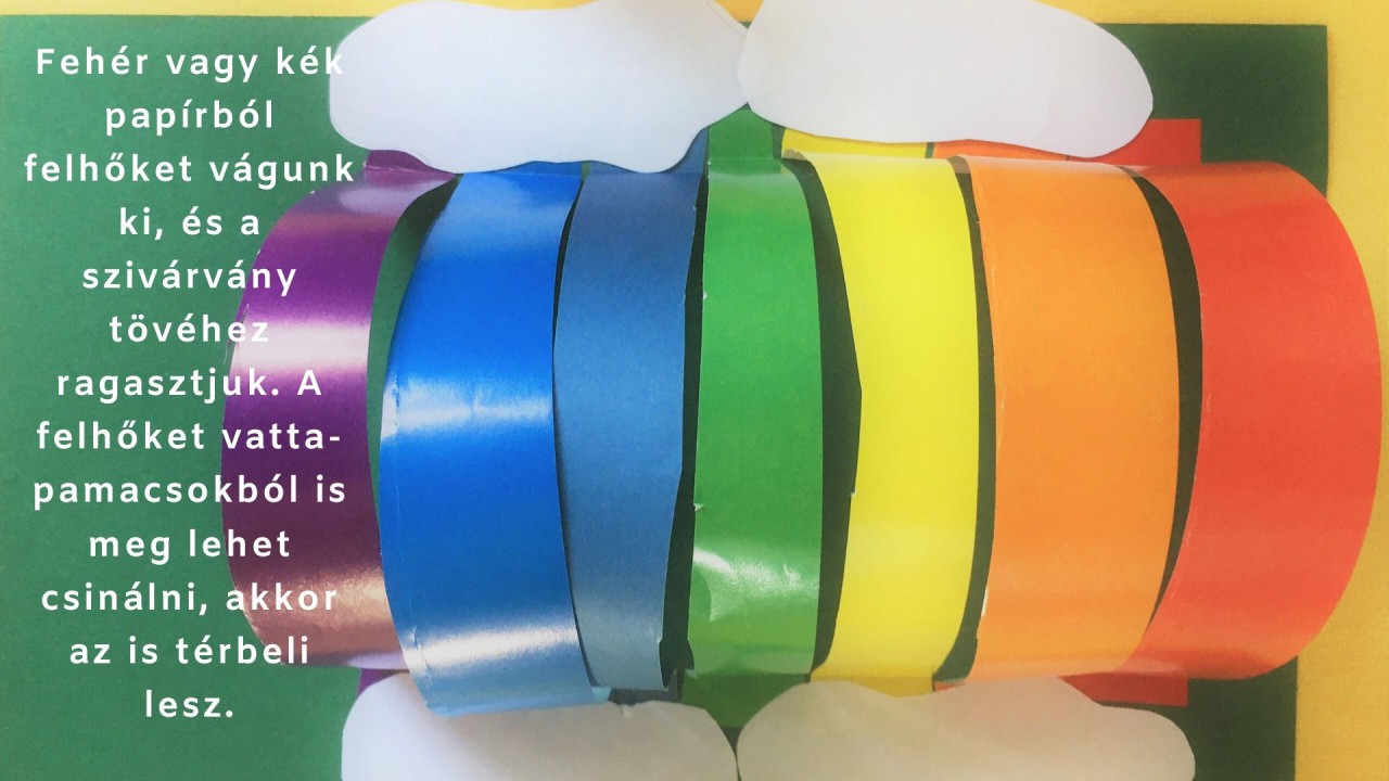 ? Fehér vagy kék papírból felhőket vágunk ki, és a szivárvány tövéhez ragasztjuk. A felhőket vattapamacsokból is meg lehet csinálni, akkor az is térbeli lesz.