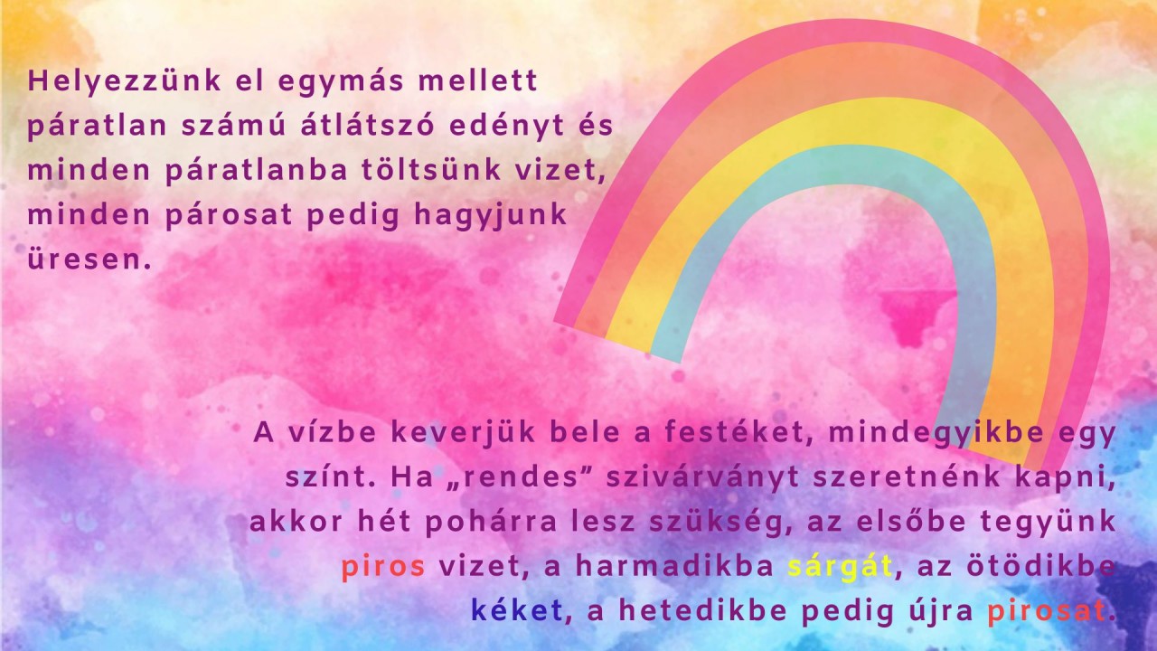A meséhez kapcsolódva szivárványos játékokat gyűjtöttünk össze erre a hétre, amelyek során alkothattok saját szivárványt és kísérletezhettek a színekkel.