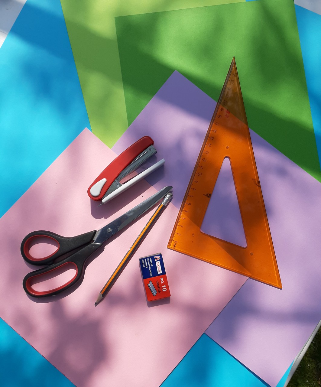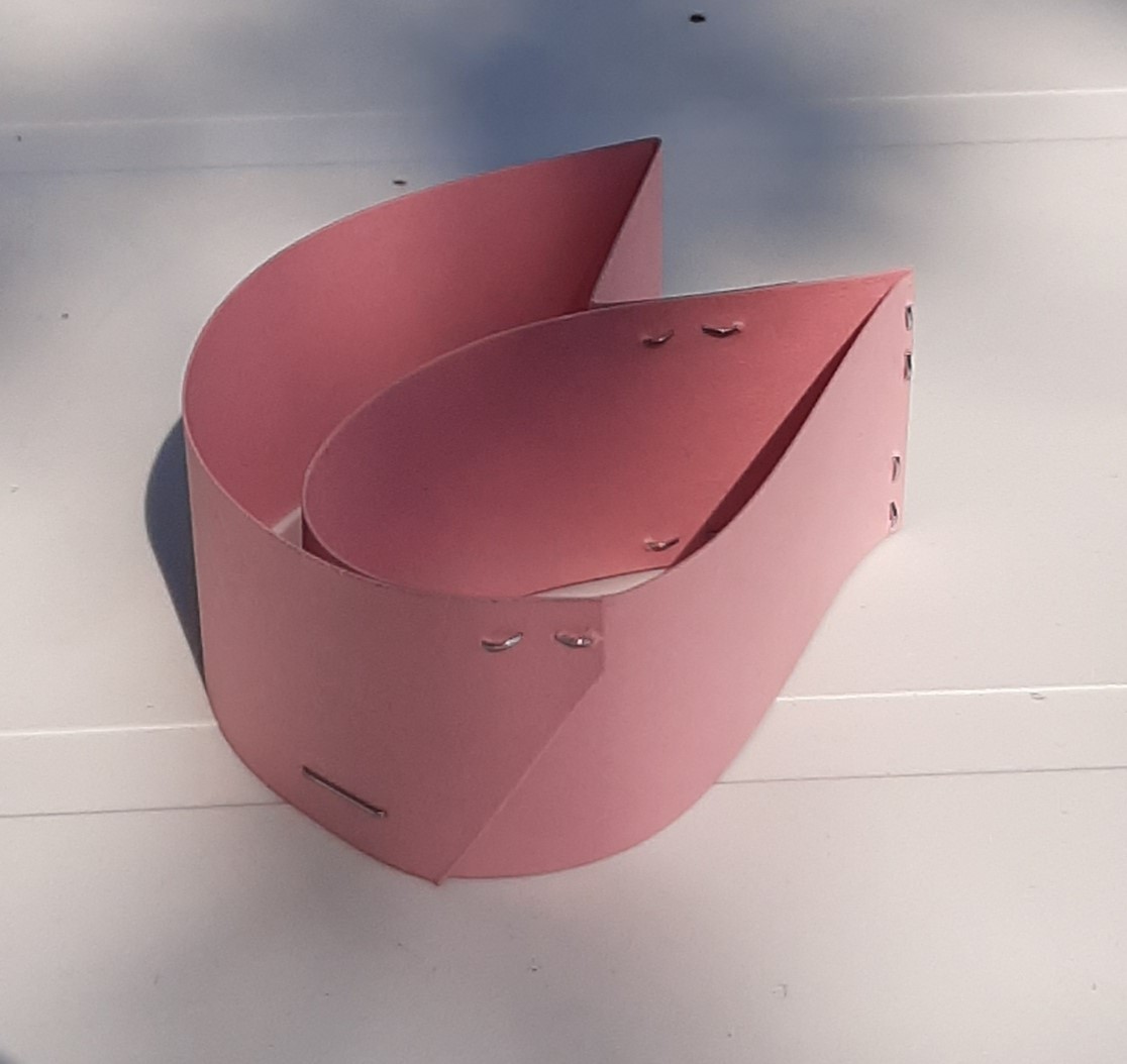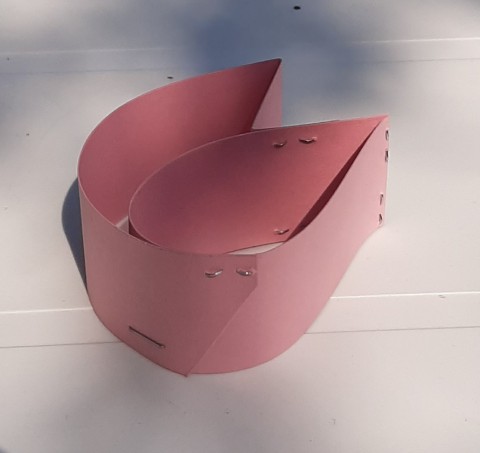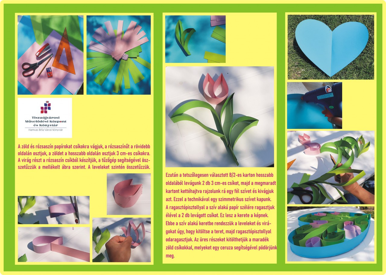 ? A zöld és rózsaszín papírokat csíkokra vágjuk, a rózsaszínűt a rövidebb oldalán osztjuk, a zöldet a hosszabb oldalán osztjuk 3 cm-es csíkokra. A virág részt a rózsaszín csíkból készítjük, a tűzőgép segítségével összetűzzük a mellékelt ábra szerint. A leveleket szintén összetűzzük.