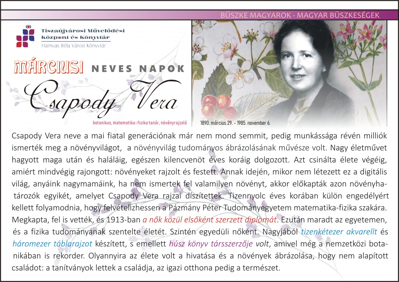 Csapody Vera botanikus, matematika–fizika tanár, növényrajzoló 1890. március 29-én született. Neve a mai fiatal generációnak már nem mond semmit, pedig munkássága révén milliók ismerték meg a növényvilágot, a növényvilág tudományos ábrázolásának művésze volt. Nagy életművet hagyott maga után és haláláig, egészen kilencvenöt éves koráig dolgozott. Azt csinálta élete végéig, amiért mindvégig rajongott: növényeket rajzolt és festett. Annak idején, mikor nem létezett ez a digitális világ, anyáink nagymamáink, ha nem ismertek fel valamilyen növényt, akkor előkapták azon növényhatározók egyikét, amelyet Csapody Vera rajzai díszítettek. Tizennyolc éves korában külön engedélyért kellett folyamodnia, hogy felvételizhessen a Pázmány Péter Tudományegyetem matematika-fizika szakára.