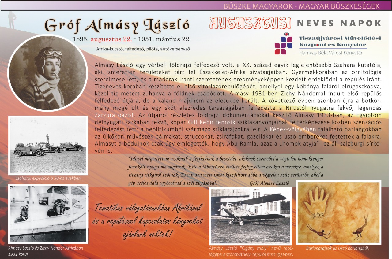Almásy László egy vérbeli földrajzi felfedező volt, a XX. század egyik legjelentősebb Szahara kutatója, aki ismeretlen területeket tárt fel Északkelet-Afrika sivatagjaiban. Gyermekkorában az ornitológia szerelmese lett és a madarak iránti szeretetének eredményeképpen kezdett érdeklődni a repülés iránt. Tizenéves korában készítette el első vitorlázórepülőgépét, amellyel egy kőbánya faláról elrugaszkodva, közel tíz métert zuhanva a földnek csapódott. Almásy 1931-ben Zichy Nándorral indult első repülős felfedező útjára, de a kaland majdnem az életükbe került. A következő évben azonban újra botkormány mögé ült és egy skót alezredes társaságában felfedezte a Nílustól nyugatra fekvő, legendás Zarzura oázist. Az útjairól részletes földrajzi dokumentációkat készítő Almásy 1933-ban, az Egyiptom délnyugati sarkában fekvő, kopár Gilf Kebir fennsík sziklakanyonjainak feltérképezése közben szenzációs felfedezést tett: a neolitikumból származó sziklarajzokra lelt. A Képek-völgyében található barlangokban az újkőkori művészek pálmákat, struccokat, zsiráfokat, gazellákat és úszó embereket festettek a falakra. Almásyt a beduinok csak úgy emlegették, hogy Abu Ramla, azaz a „homok atyja" – ez áll a salzburgi sírkövén is.
