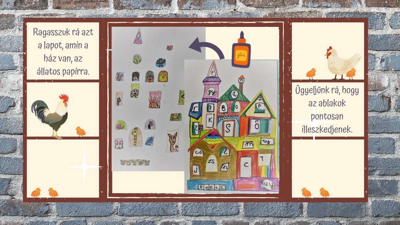 - Ragasszuk rá azt a lapot, amin a ház van, az állatos papírra. Ügyeljünk rá, hogy az ablakok pontosan illeszkedjenek.