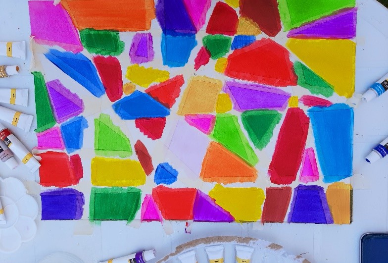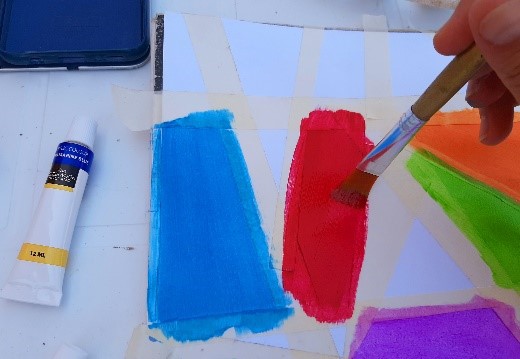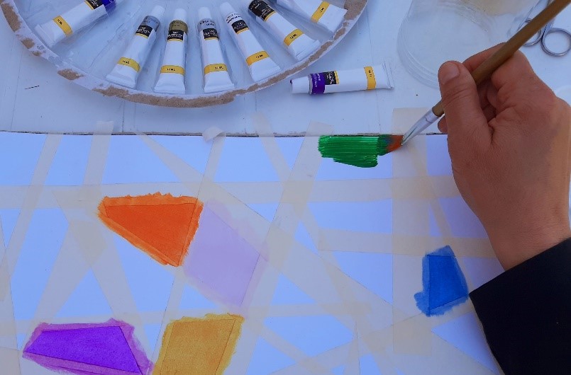? A vastag ecsetet vesszük elő, azzal festjük a kimaszkolt felületeket. Festésnél ügyeljünk arra, hogy ne fessünk bele a másik kimaszkolt részbe. Ha ezzel készen vagyunk és a festék megszáradt, lehúzhatjuk a lapról a szalagokat.