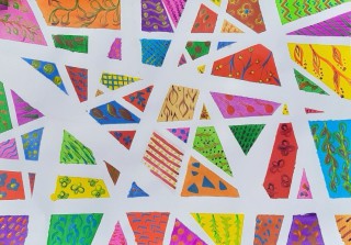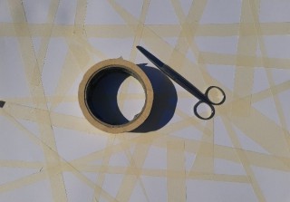 ? A maszkoló fóliából csíkokat vágunk, melyeket tetszőlegesen ráragasztunk a papírra. Ha vastagabb ragasztószalag van otthon, akkor ollóval szétvágjuk.
