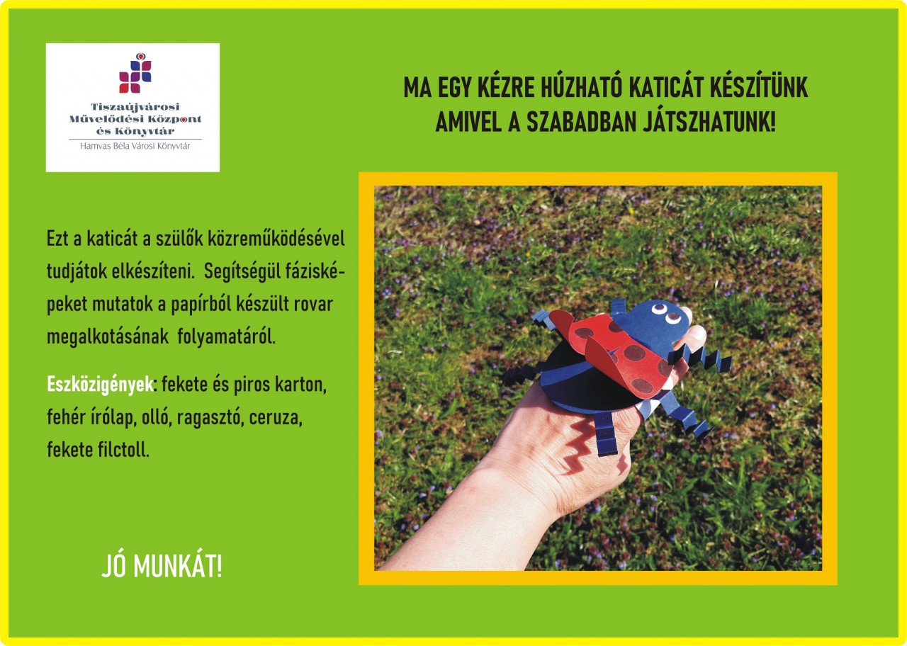 Ma egy kézre húzható katicát készítünk, amivel a szabadban játszhatunk. Ezt a katicát a szülők közreműködésével tudjátok elkészíteni. Segítségül fázisképeket mutatok a papírból készült rovar megalkotásának folyamatáról.