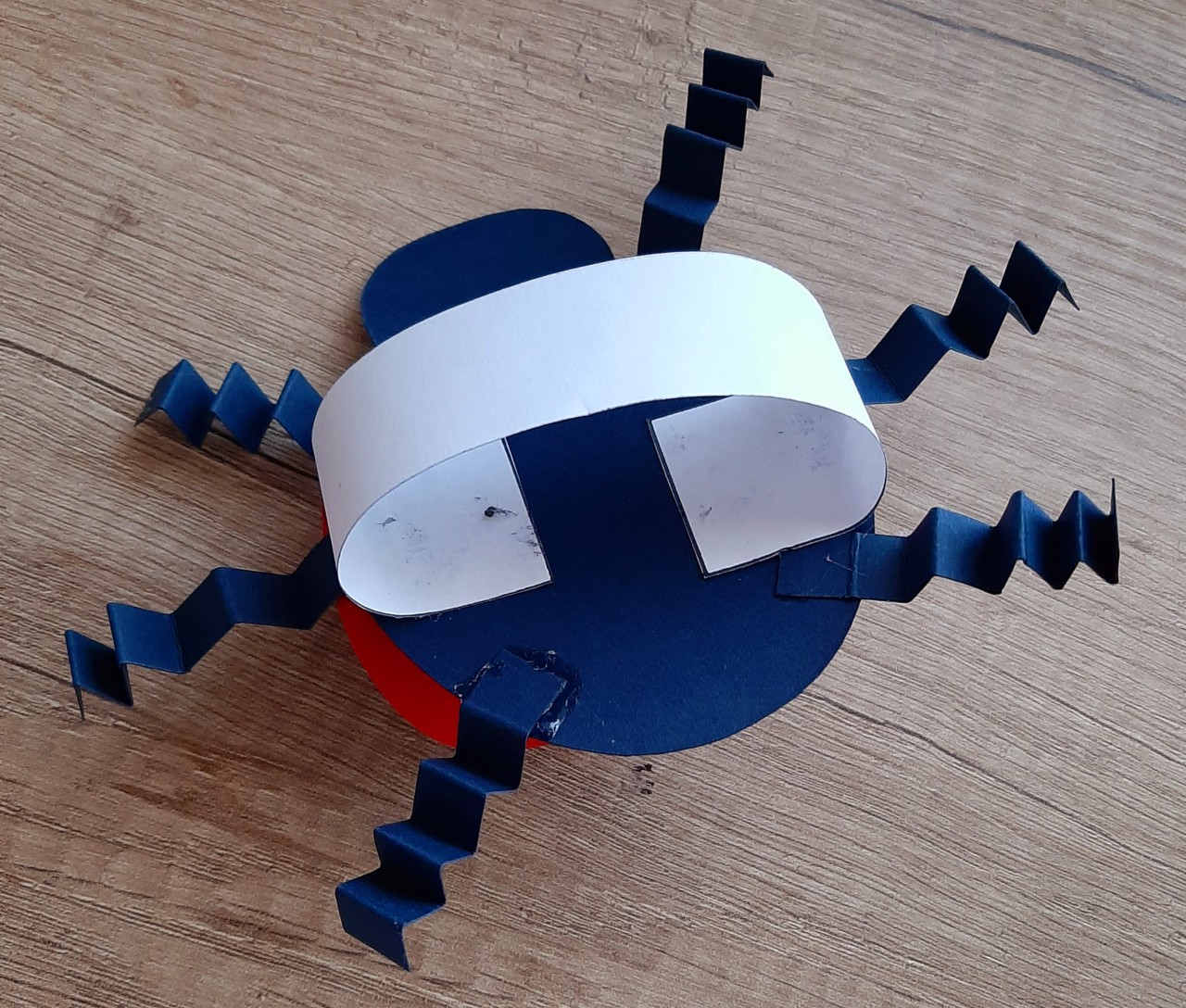 ? Ezután a hat lábat meghajtogatjuk cikk-cakk formában, majd alulról a testre ragasztjuk a fehér fogantyúval együtt. Ezt a fehér papírcsíkot úgy ragasztjuk fel, hogy a gyerek kezének méretéhez igazodjon.