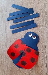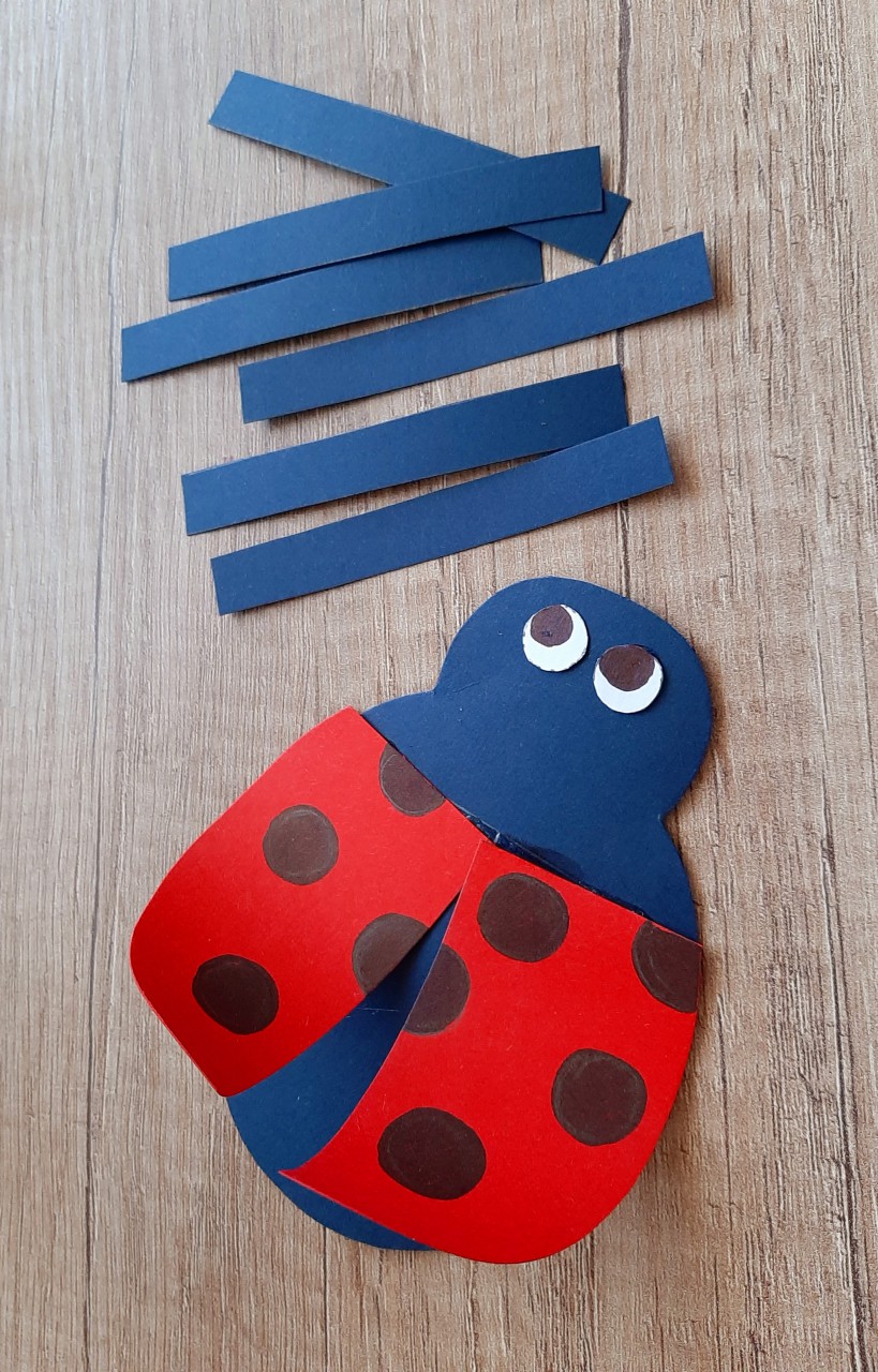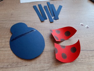 ? Ha kivágtuk a formákat, fekete pöttyöket festünk a szárnyra és szemgolyót a szemre a fekete filctollal. A filctoll segítségével meghajlítjuk a szárnyakat, hogy szép íves legyen. A két szárnyat és a szemeket ráragasztjuk a katica testére a jelzésnél.