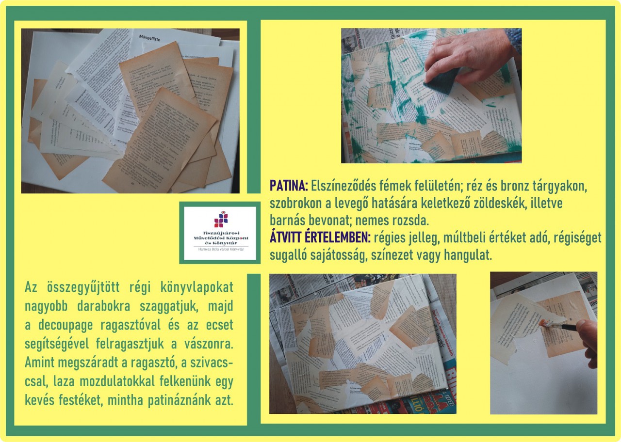 ? Amint megszáradt a ragasztó, a szivaccsal, laza mozdulatokkal felkenünk egy kevés festéket, mintha patináznánk azt. PATINA: Elszíneződés fémek felületén; réz és bronz tárgyakon, szobrokon a levegő hatására keletkező zöldeskék, illetve barnás bevonat; nemes rozsda. ÁTVITT ÉRTELEMBEN: régies jelleg, múltbeli értéket adó, régiséget sugalló sajátosság, színezet vagy hangulat.
