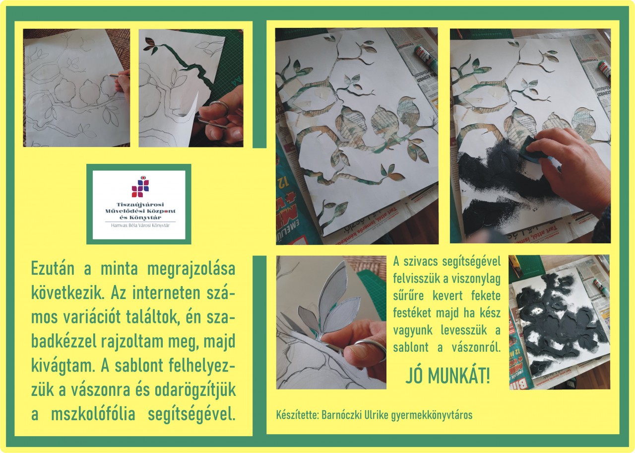 ? A szivacs segítségével felvisszük a viszonylag sűrűre kevert fekete festéket, majd ha kész vagyunk, levesszük a sablont a vászonról.