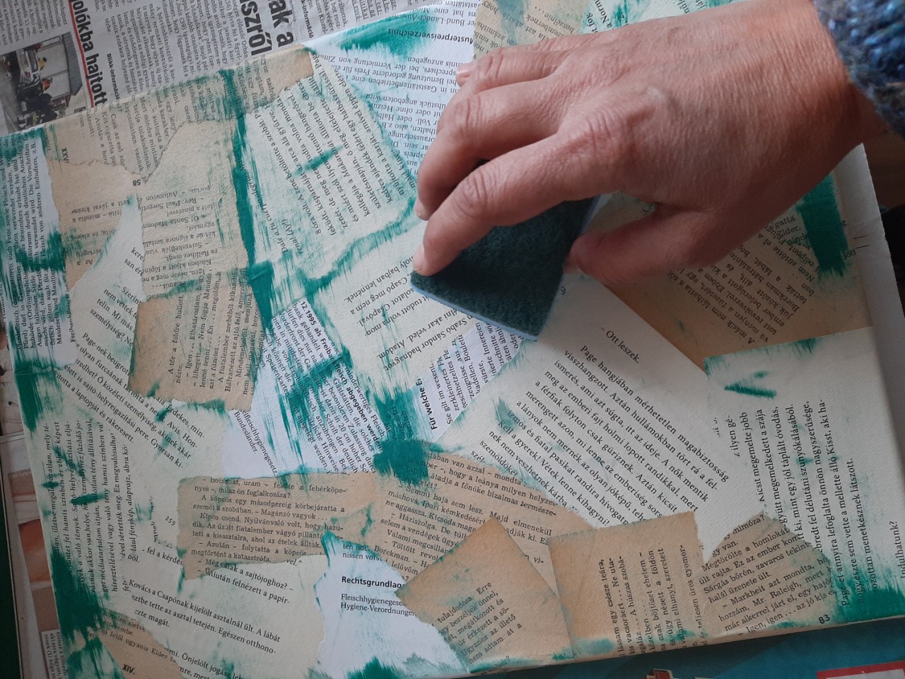 ? Az összegyűjtött régi könyvlapokat nagyobb darabokra szaggatjuk, majd a decoupage ragasztóval és az ecset segítségével felragasztjuk a vászonra.