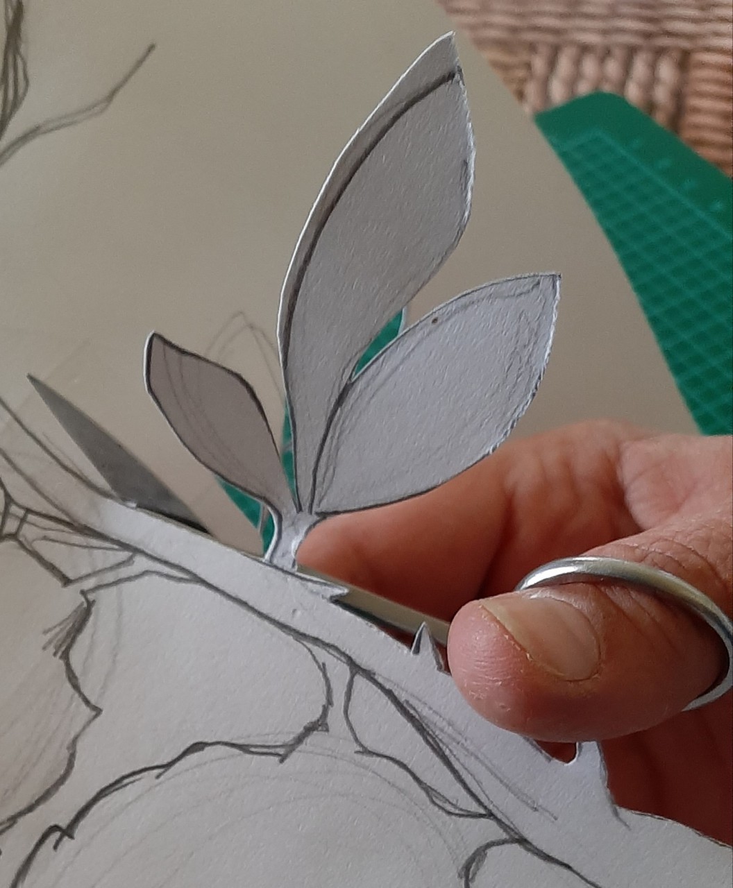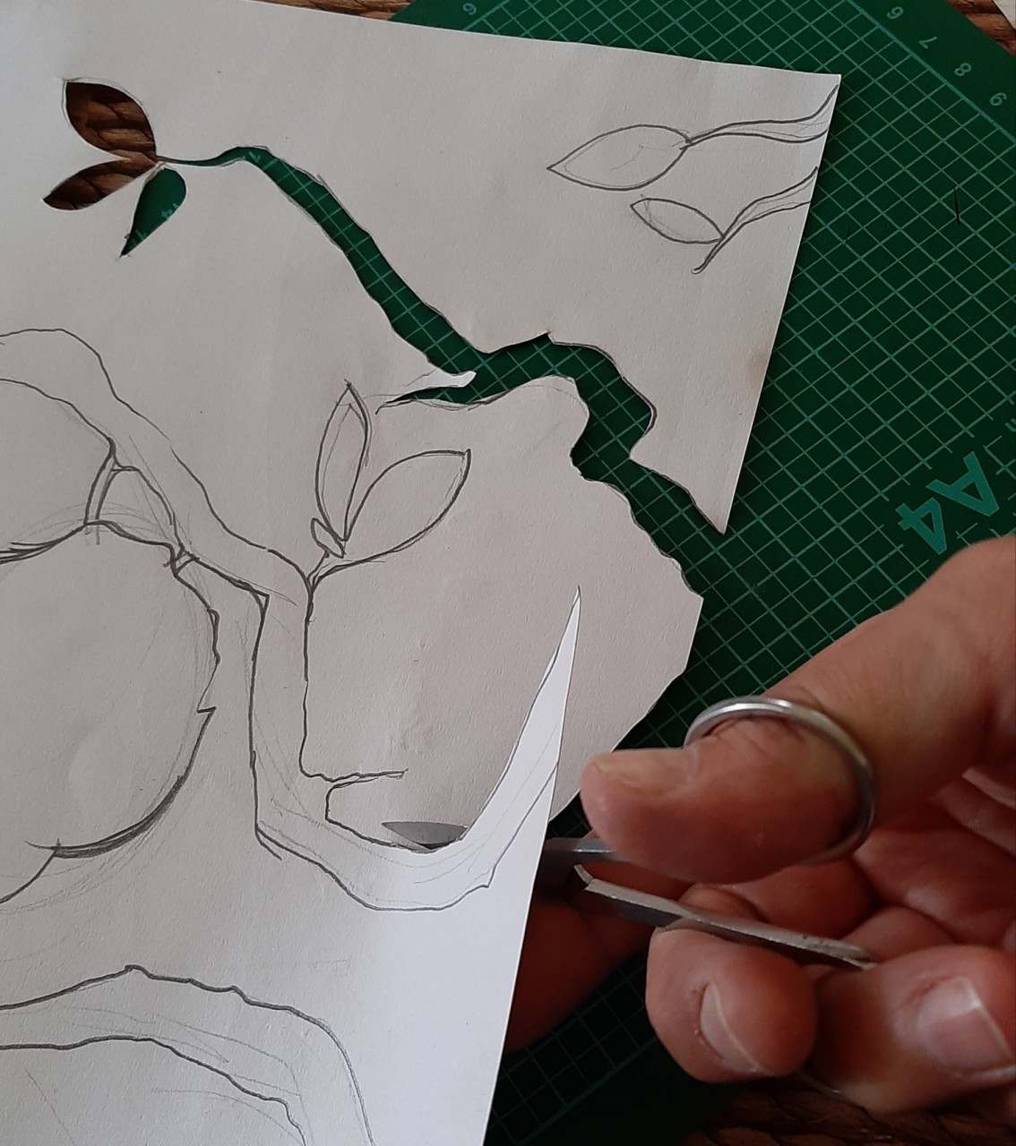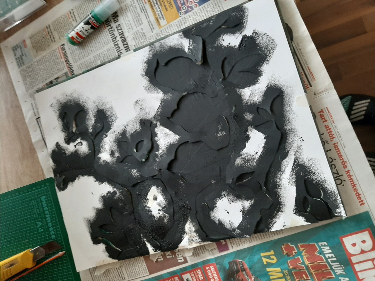 ? Ezután a minta megrajzolása következik. Az interneten számos variációt találtok, én szabadkézzel rajzoltam meg, majd kivágtam. A sablont felhelyezzük a vászonra és odarögzítjük a maszkolófólia segítségével.