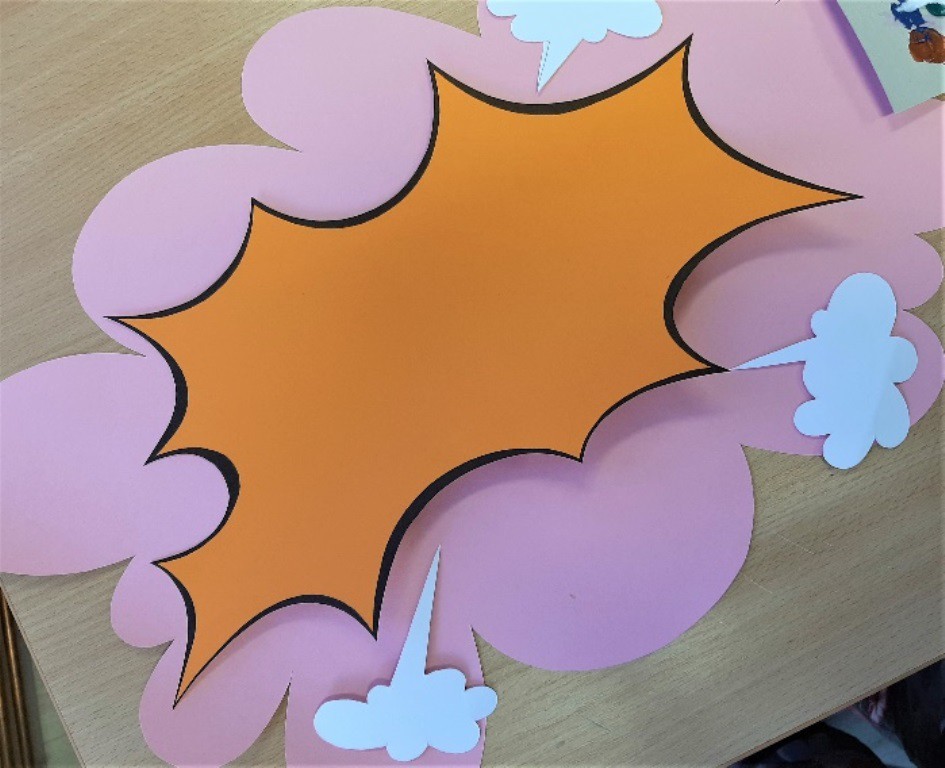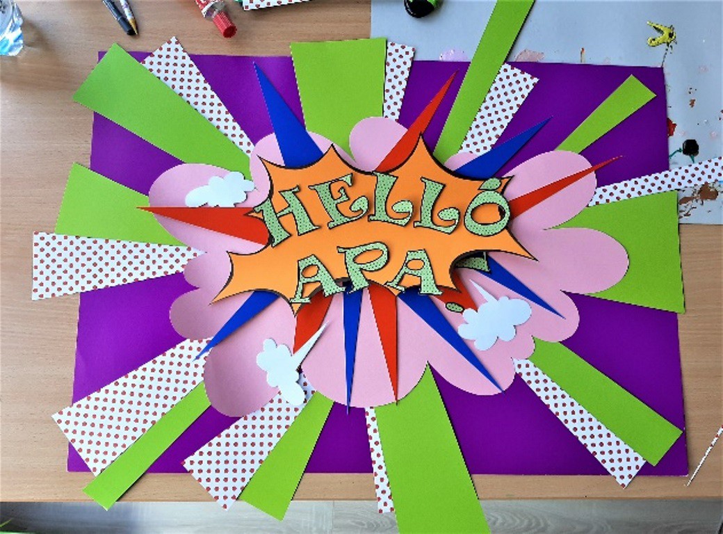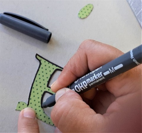 Miután a szövegrészt kinyomtattuk, indigóval átrajzoljuk a pöttyös kartonra, kivágjuk, majd ennek is kihúzzuk a szélét filccel.