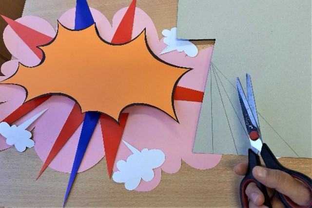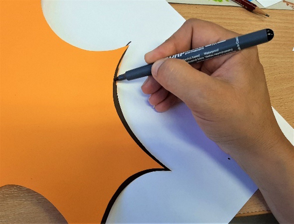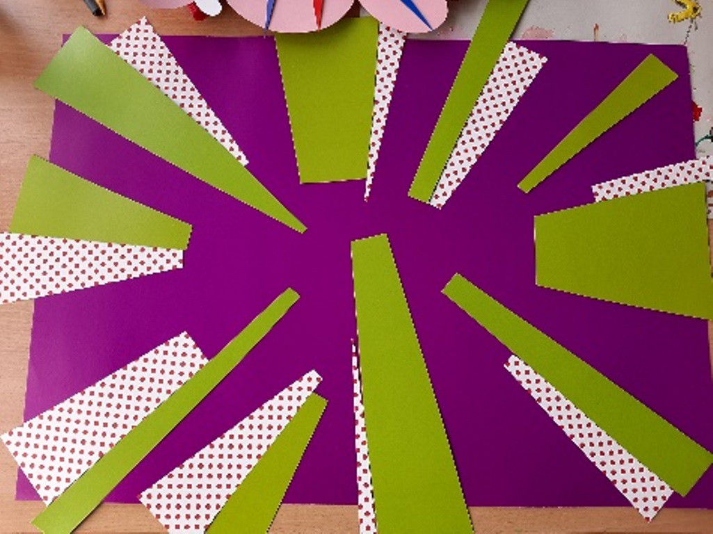 Munkánkat a lapok kiválasztásával kezdjük. A kép rétegeit elkezdjük elkészíteni, a mellékelt képek alapján. A mintákat szabadkézzel rajzoljuk meg, miután kivágtuk, a szélüket alkoholos filccel húzzuk ki.