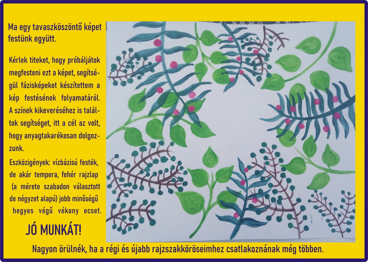 Ma egy tavaszköszöntő képet festünk együtt. Kérlek titeket, hogy próbáljátok megfesteni ezt a képet, segítségül fázisképeket készítettem a kép festésének folyamatáról. A színek kikeveréséhez is találtok segítséget, itt a cél az volt, hogy anyagtakarékosan dolgozzunk.