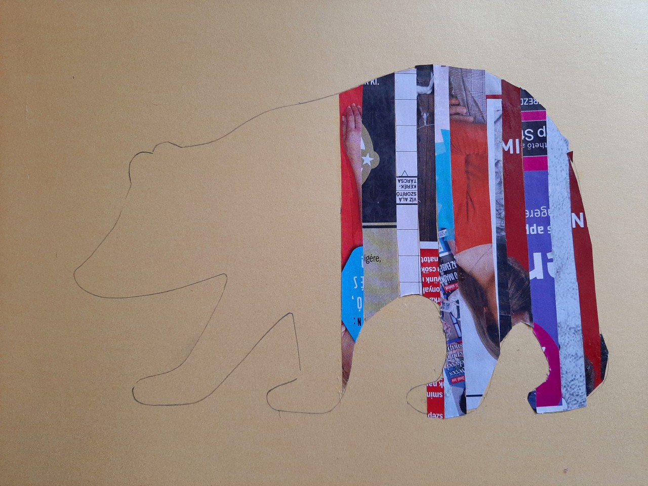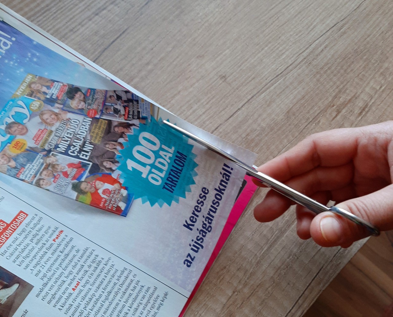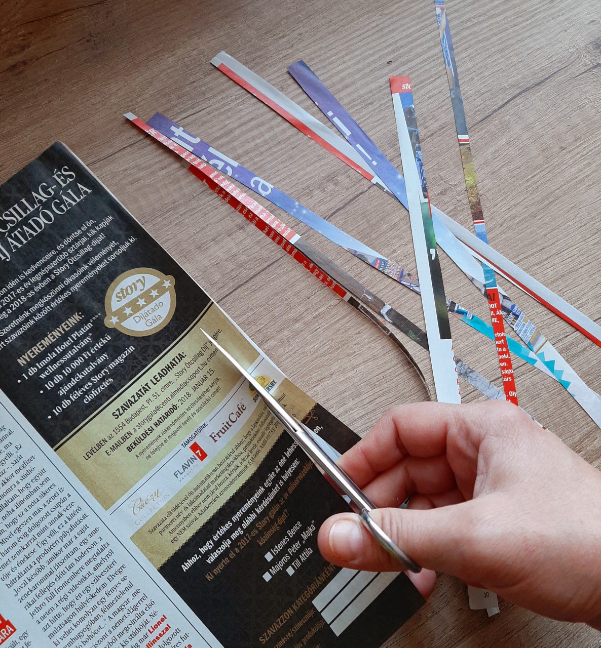 ✂️ A színes magazinból különböző vastagságú csíkokat vágunk ki, a fél cm-estől a másfél cm-es méretig. Próbáljunk meg színesebb és szöveges csíkokat is vágni, hogy minél változatosabb legyen majd az elkészült képünk. Én medve formát választottam de ti bármilyen állatot választhattok. ????