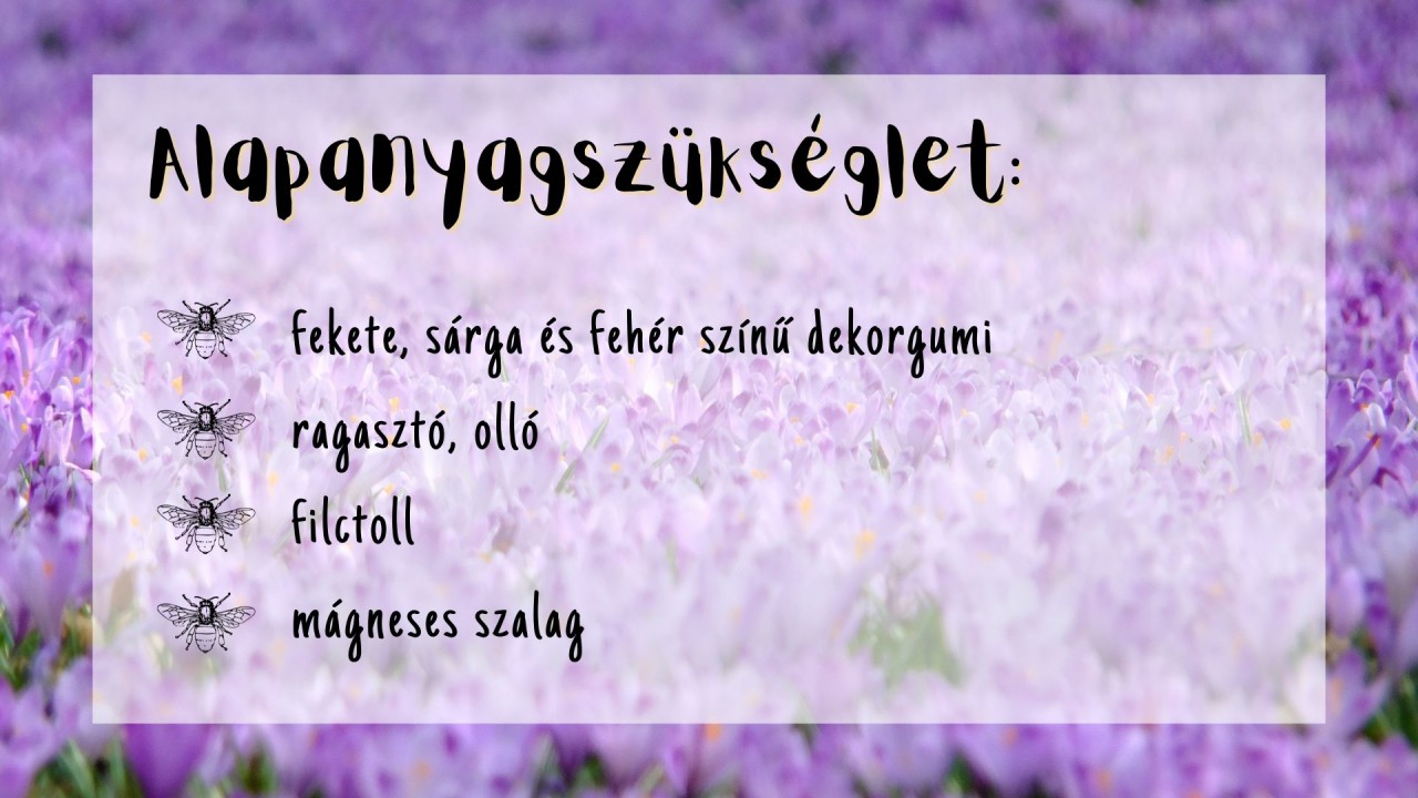Rajzolunk egy méh formát, csíkokkal és szárnyakkal együtt. A méh testét készítsük el egyrészt sárga dekorgumiból, másrészt a szárnyakkal együtt fehérből is. A csíkokat feketéből vágjuk ki.