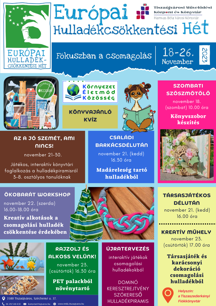 Idén novemberben már 15. éve kerül megrendezésre az Európai Hulladékcsökkentési Hét, melyhez könyvtárunk is csatlakozott. Minden évben más tematikát hirdetnek meg, 2023-ban a csomagolás került a középpontba. Ez azért is aktuális, mert a teljes műanyagfelhasználás 40%-a és a teljes papírfelhasználás 50%-a az EU-ban csomagolási célokat szolgál, és ezek jelentős része (36%-a) vész kárba, azaz végzi települési szilárd hulladékként.
