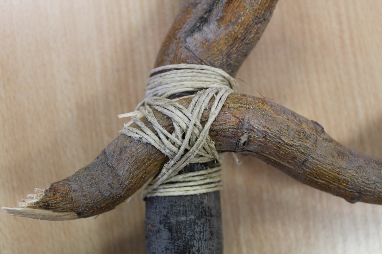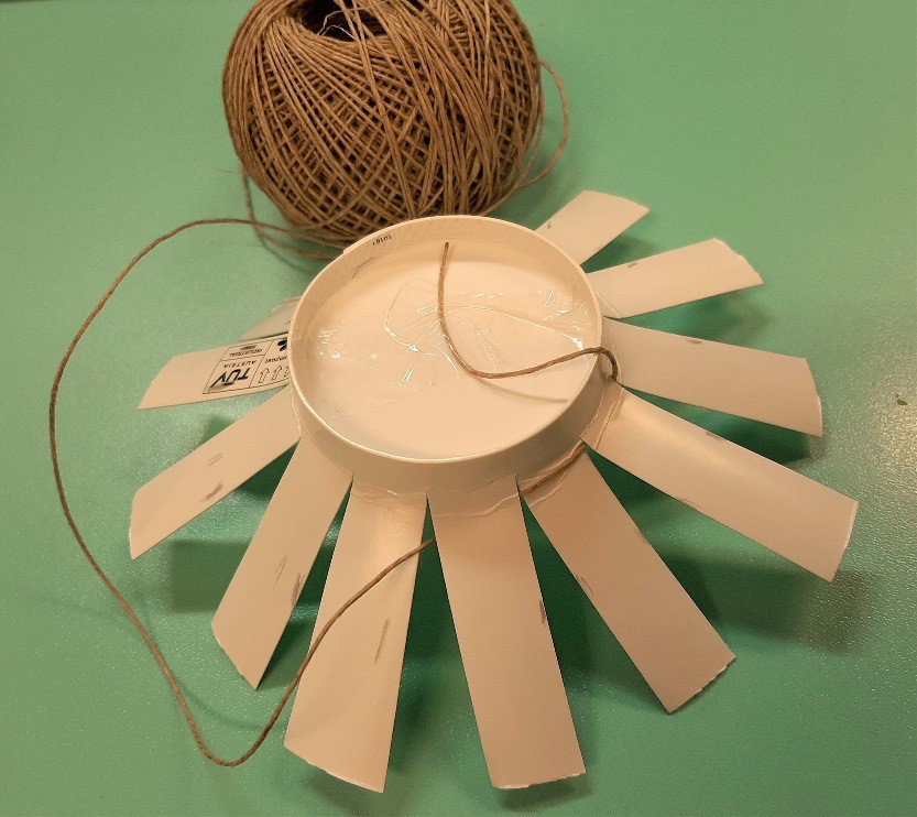 A papírpoharat páratlan számú sávokban bevágjuk, majd fejjel lefele lefordítva a zsinórt körben rátekerjük a mellékelt ábra szerint. A zsinór körültekerése folytán, a