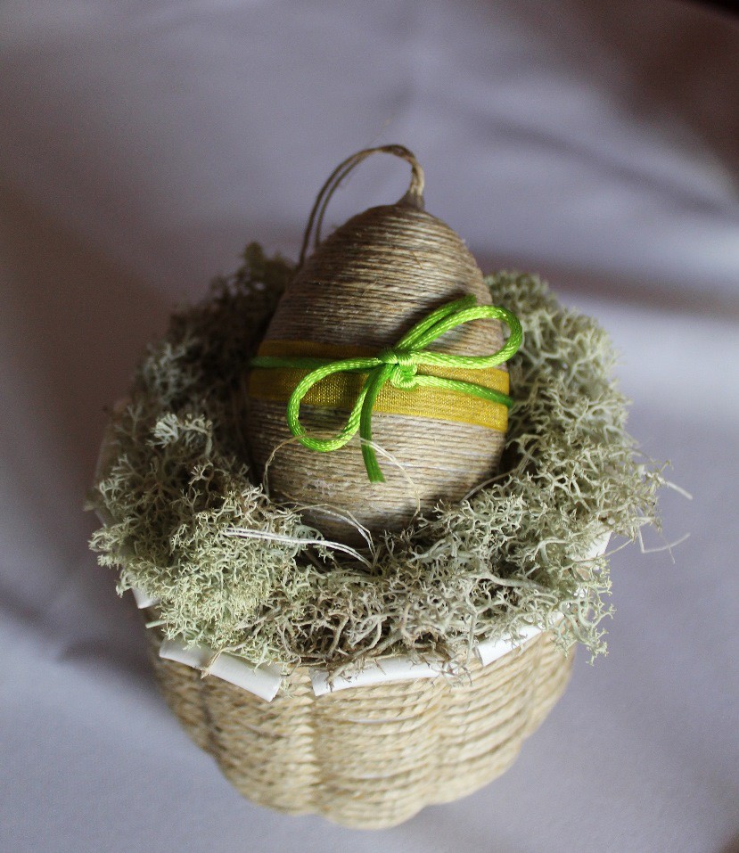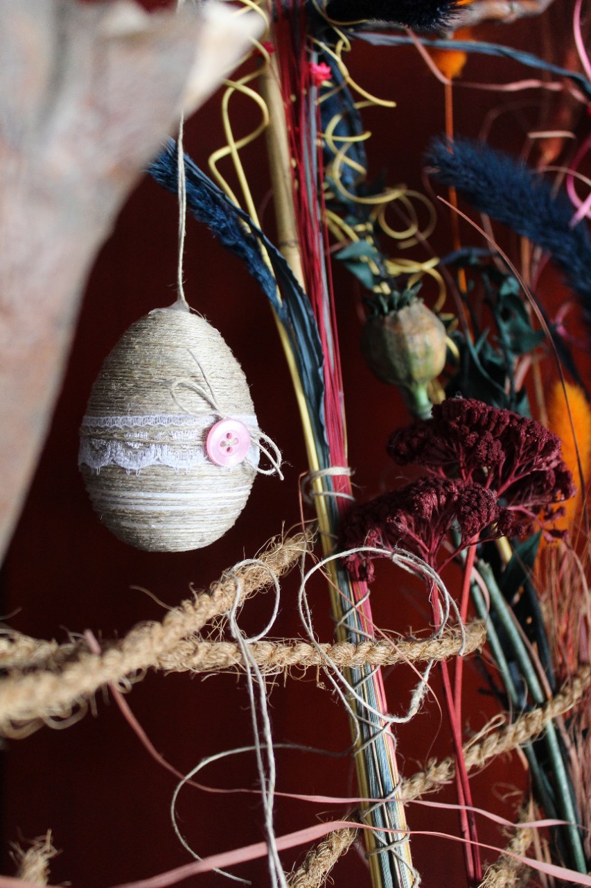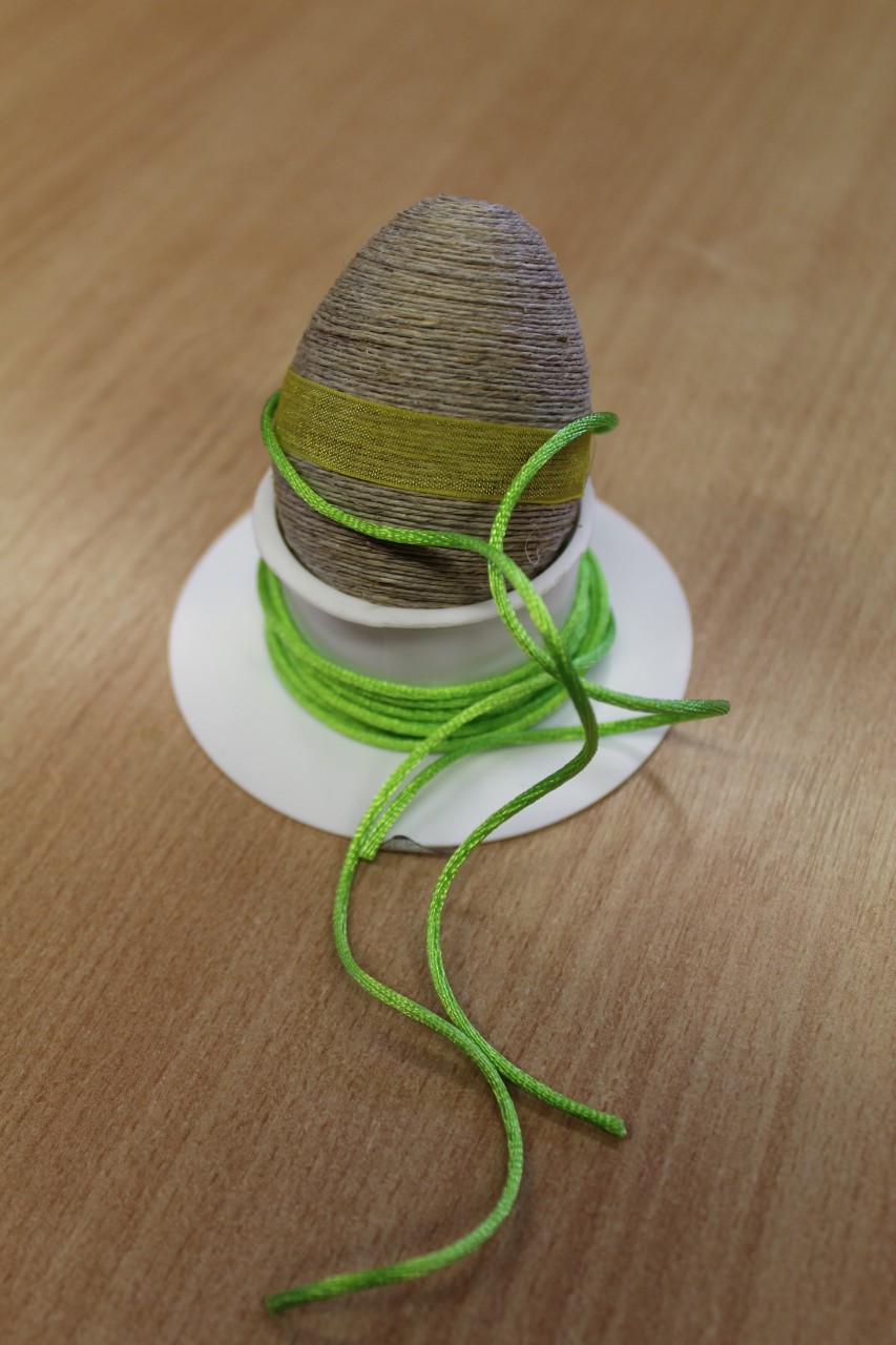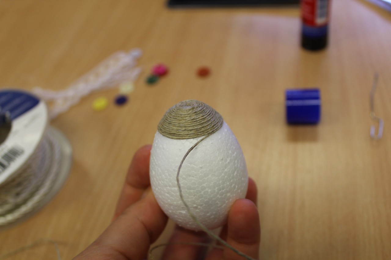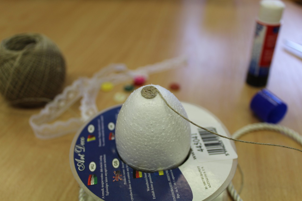 A hungarocell tojásra stift ragasztó segítségével spirálisan rátekerjük a zsinórt úgy, hogy a kezdésnél egy tűvel lyukat szúrunk a tojás végébe és abba helyezzük a zsinór végét.