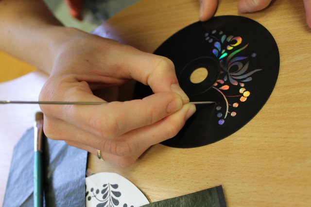 A feleslegessé vált CD lemezt egy szivaccsal befestjük vízbázisú festékkel, majd száradás után indigó használatával felvisszük a kívánt mintát. Egy tűvel, vagy fogpiszkálóval visszaszedjük a festéket az átrajzolt mintán.