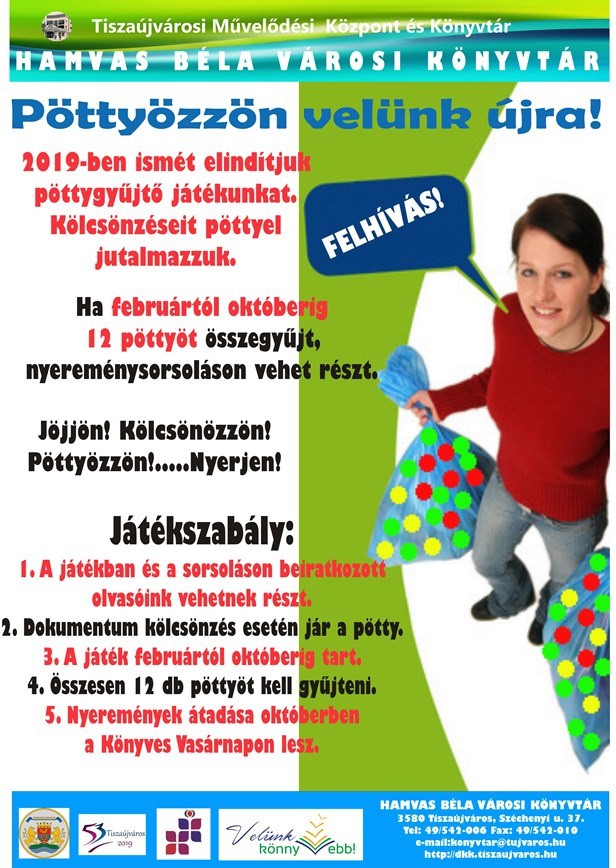 2019. februárjában indítottuk útjára "Pöttyözzön velünk újra" nyereményjátékunkat, mely során minden kölcsönzést pöttyel jutalmaztunk. A részvételi feltétel az volt, hogy beiratkozott olvasóink februártól októberig 12 alkalommal éljenek a kölcsönzés lehetőségével. Aki ezt teljesítette, és gyűjtőfüzetét telepöttyözte, sorsoláson vehetett részt.