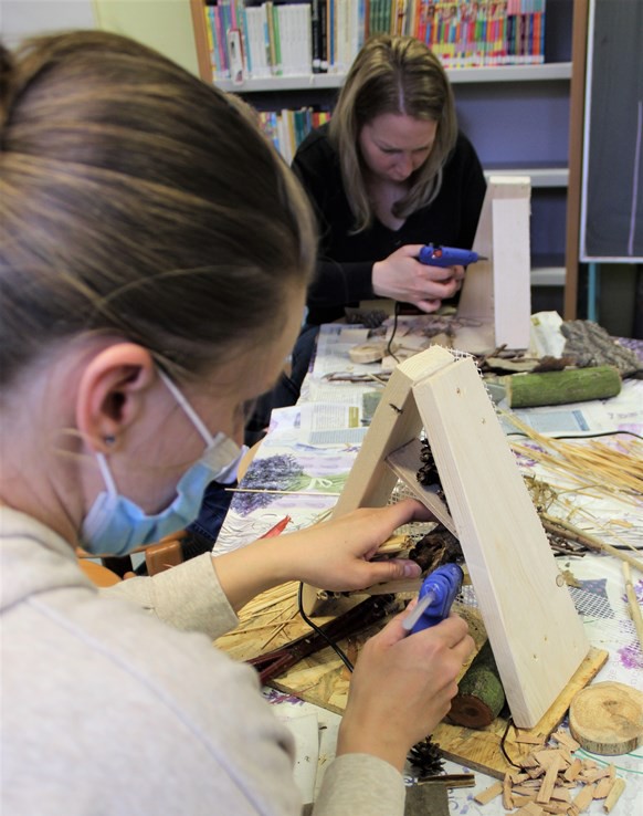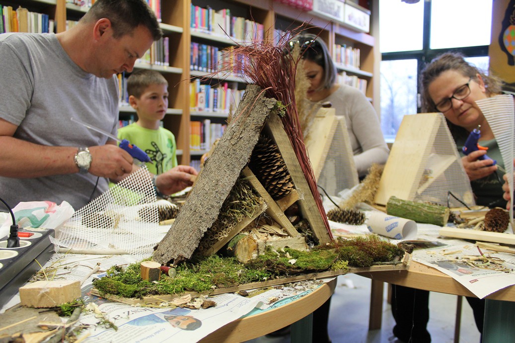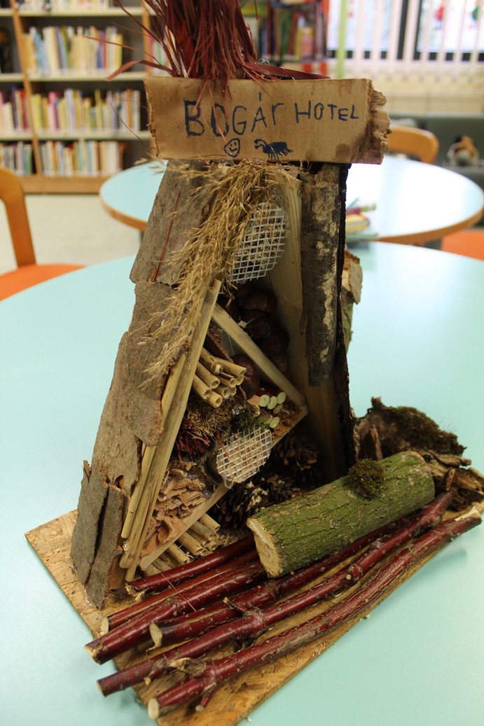 A rovarhotelbe nagyon sokféle anyagot építhetünk be, de mi törekedtünk arra, hogy azok természetes eredetű és környezetbe illőek legyenek. A rovarhotel készítése minimális költségráfordítással is megoldható, csak nyitott szemmel kell járni a városban, a parkokban, az erdőben. Gyűjtöttünk kicsi tobozokat, gallyakat, nádat, faháncsot, mohát. A rovarhotelnek mindenképp alakítsunk ki tetőt, hogy védve legyen a csapadéktól. Mi több szintet (emeletet) és elválasztót hoztunk létre. Tehetünk bele kérges farönk szeleteket különböző vastagságban, melyekbe lyukakat fúrunk, a magányos méheknek és darazsaknak alakítva ki a darázsgarázst. Másik részbe sűrűn összerendezett ág- vagy kéregkötegeket, esetleg szorosan összekötözött nádszálakat rakhatunk.