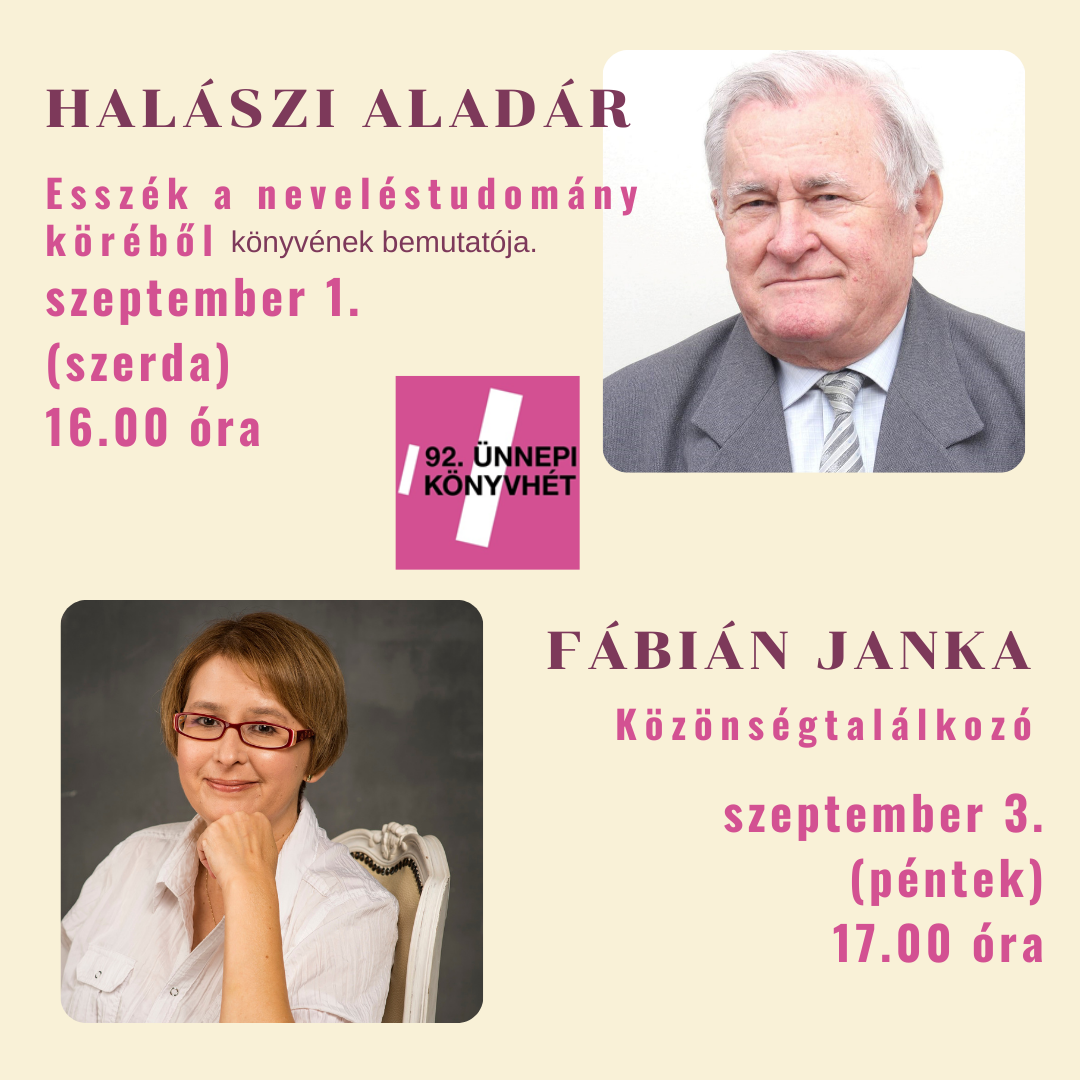 Az Ünnepi Könyvhét a kortárs magyar irodalom legnagyobb ünnepe, amely 92 éve rendületlen népszerűségnek örvend országszerte, lehetőséget adva az írókkal, költőkkel való találkozásra, beszélgetésre. A Magyar Könyvkiadók és Könyvterjesztők Egyesülése minden évben nyilvánosságra hozza a magyar kortárs irodalom legfrissebb, első vagy átdolgozott kiadású műveinek listáját. Ebből az alkalomból négy könyvbemutatóra is sor kerül könyvtárunkban. Szeptember 1-jén Halászi Aladár Esszék a neveléstudomány köréből című új kötetét ismerhették meg a könyvtárlátogatók. Szeptember 3-án (péntek) 17 órától pedig napjaink egyik legismertebb magyar regényírójával, Fábián Jankával találkozhat a közönség. Az írónővel Tokaji Edit beszélget. Szeptember 8-án (szerda) 17.00 órától a Kezedben a jövőd! című sorozatunk keretében – szintén a Zöld hónaphoz csatlakozva – Tóth Andi zéró hulladék aktivista Dobd ki a szemetest! című könyvének bemutatója kapcsán avatja be a közönséget a hulladékminimalizálás rejtelmeibe. Hasznos tanácsokat kaphatunk arra vonatkozólag, hogyan termelhetünk háztartásunkban minél kevesebb szemetet.